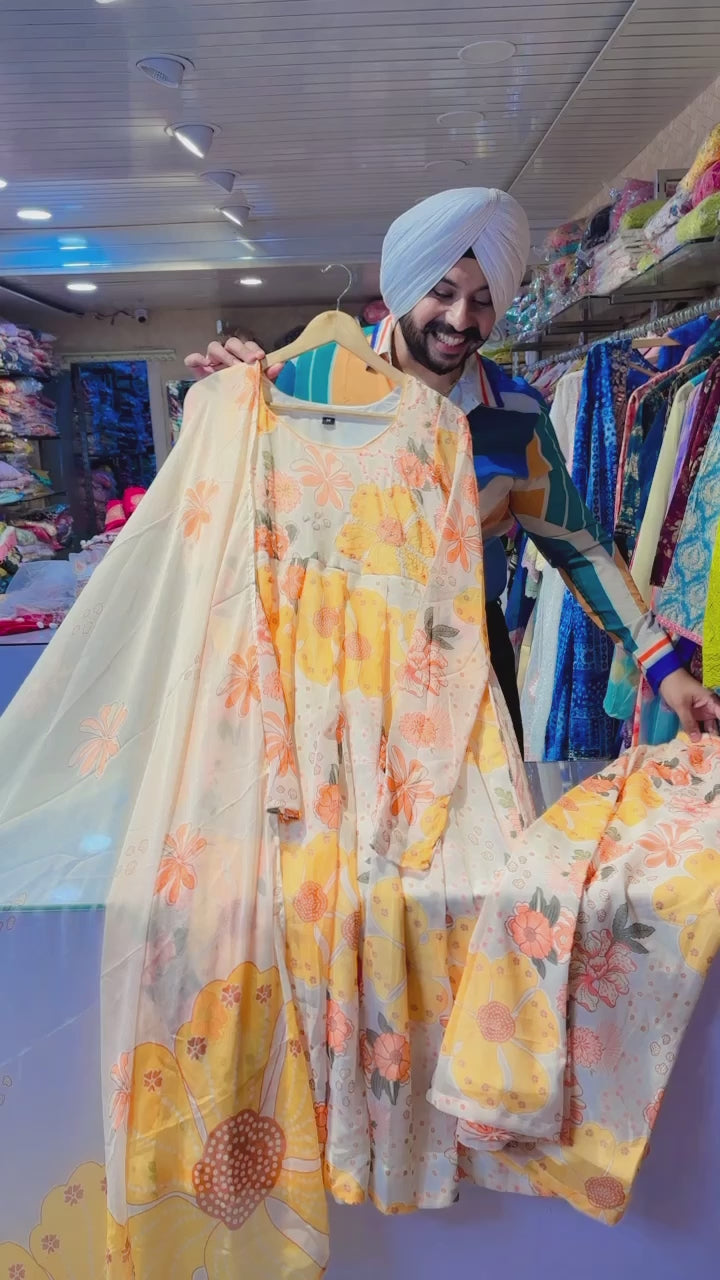 Cream & yellow chiffon Plazo Anarkali suit With Beautiful