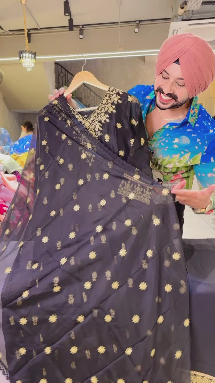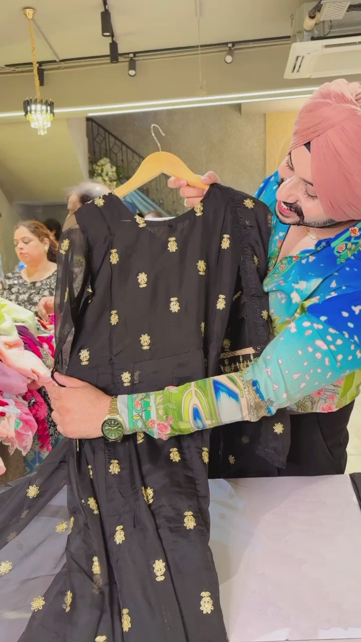 Black V-neck Organza Fully embroidered Anakali suit With embroidered Duppata