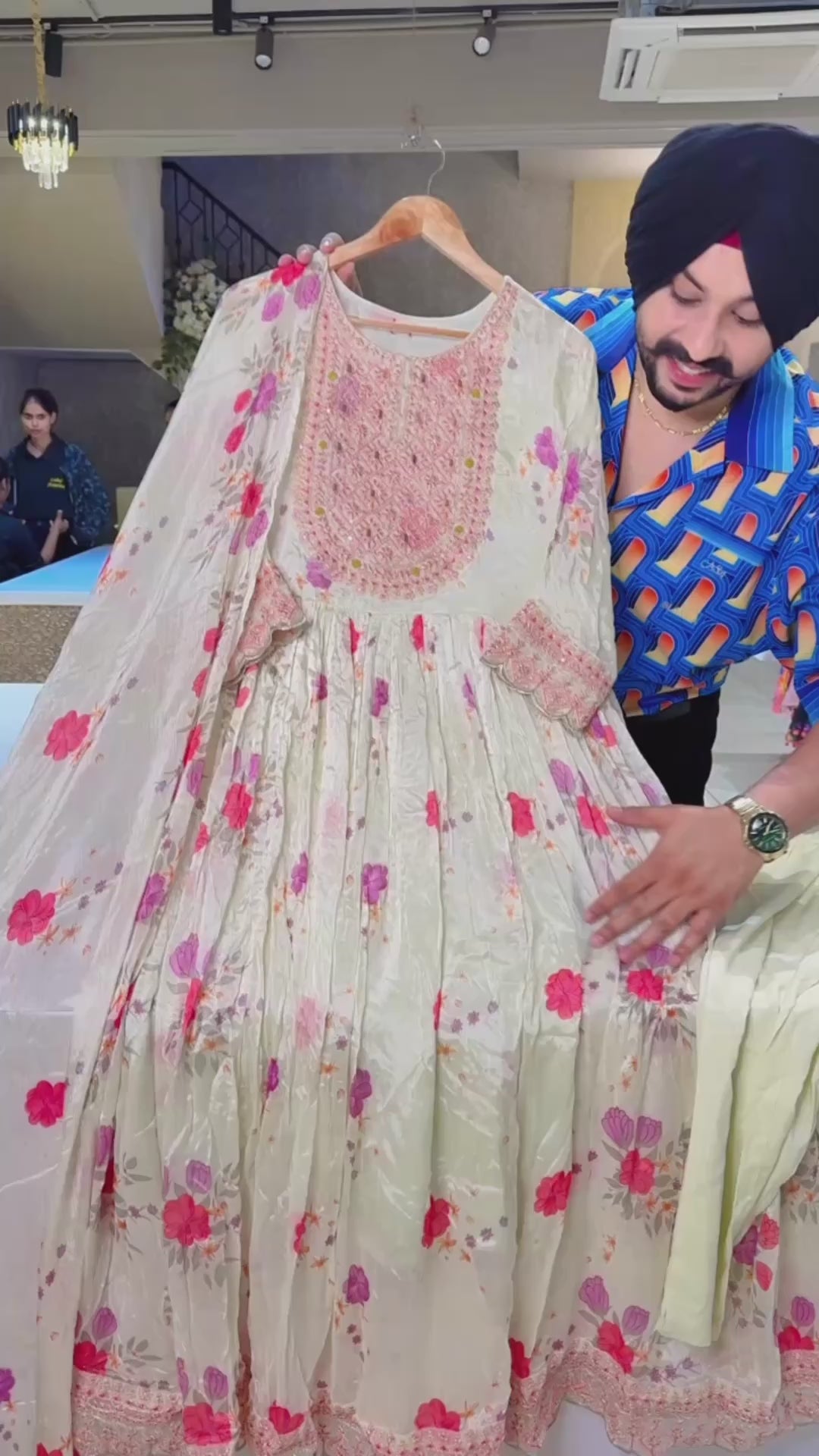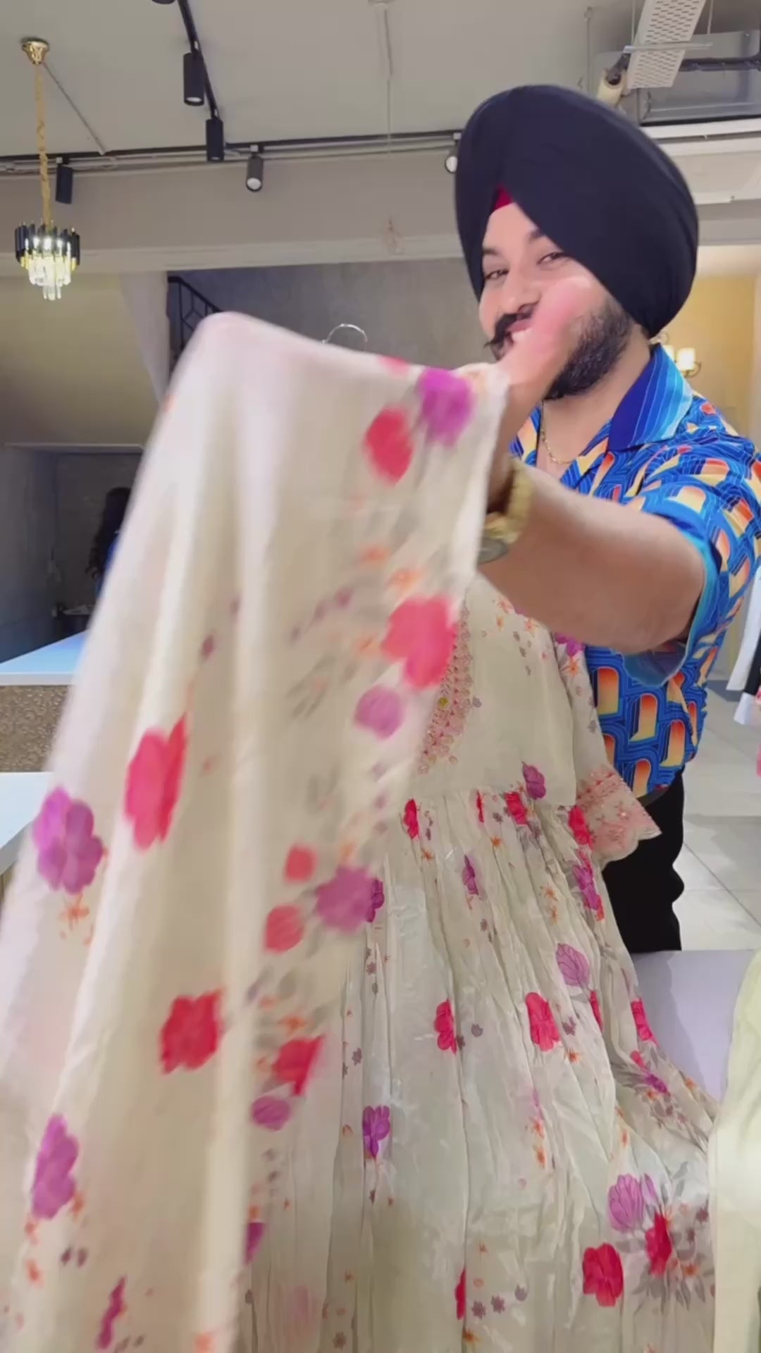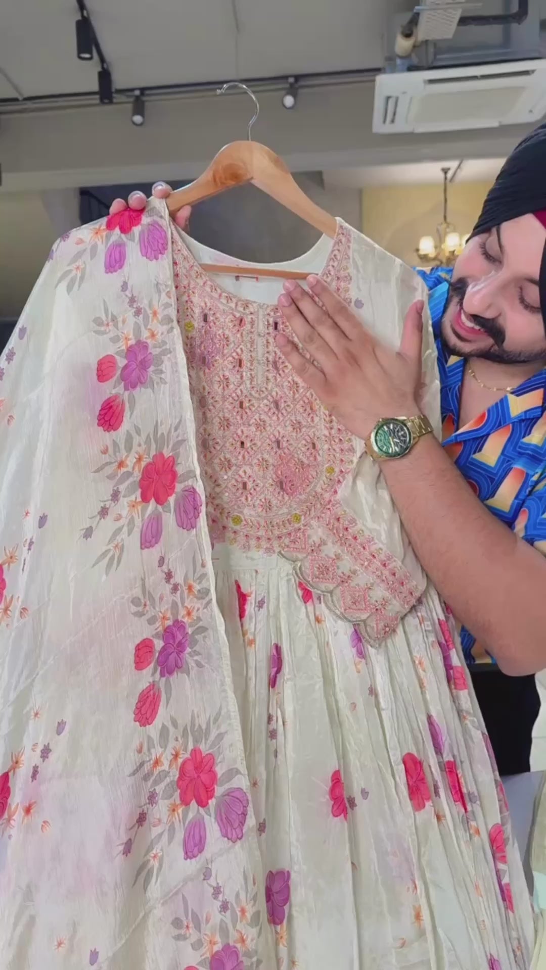 Cream Chinon Heavy Embroidered Floral Print Full Flair Anarkali Suit With Beautiful Duppata
