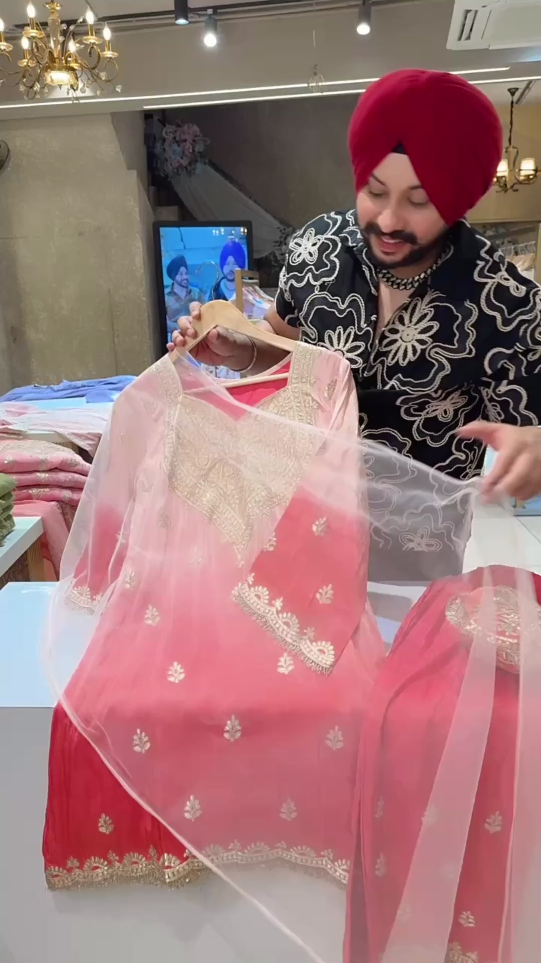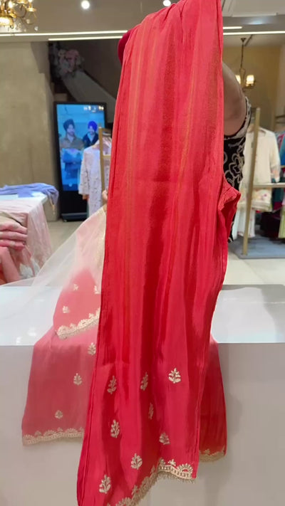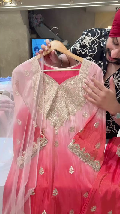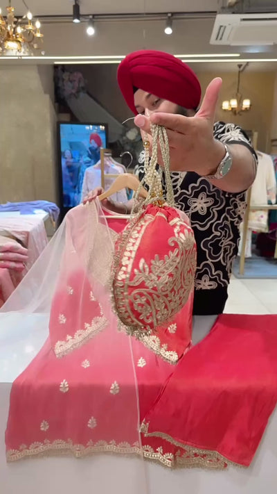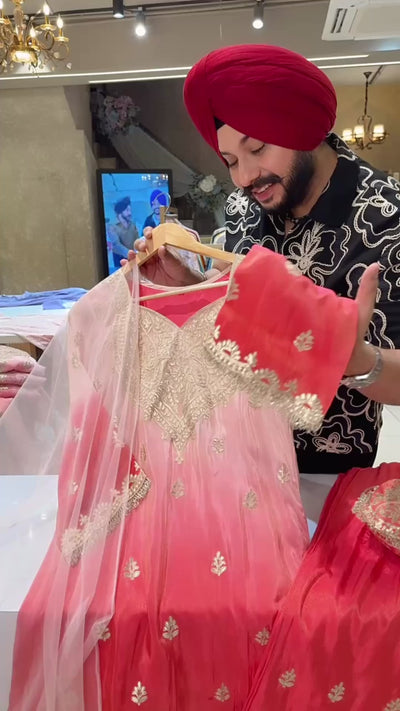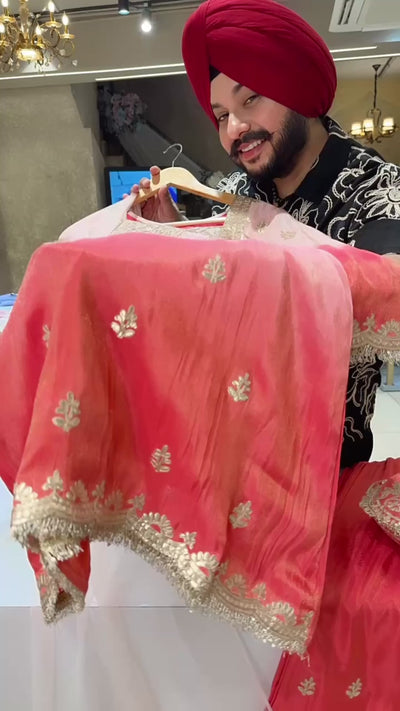 Baby Pink & Gajri Ombre Print Gotta Embroidered Indowestern western Girish Suit with Heavy Potli & Sleek Duppata
