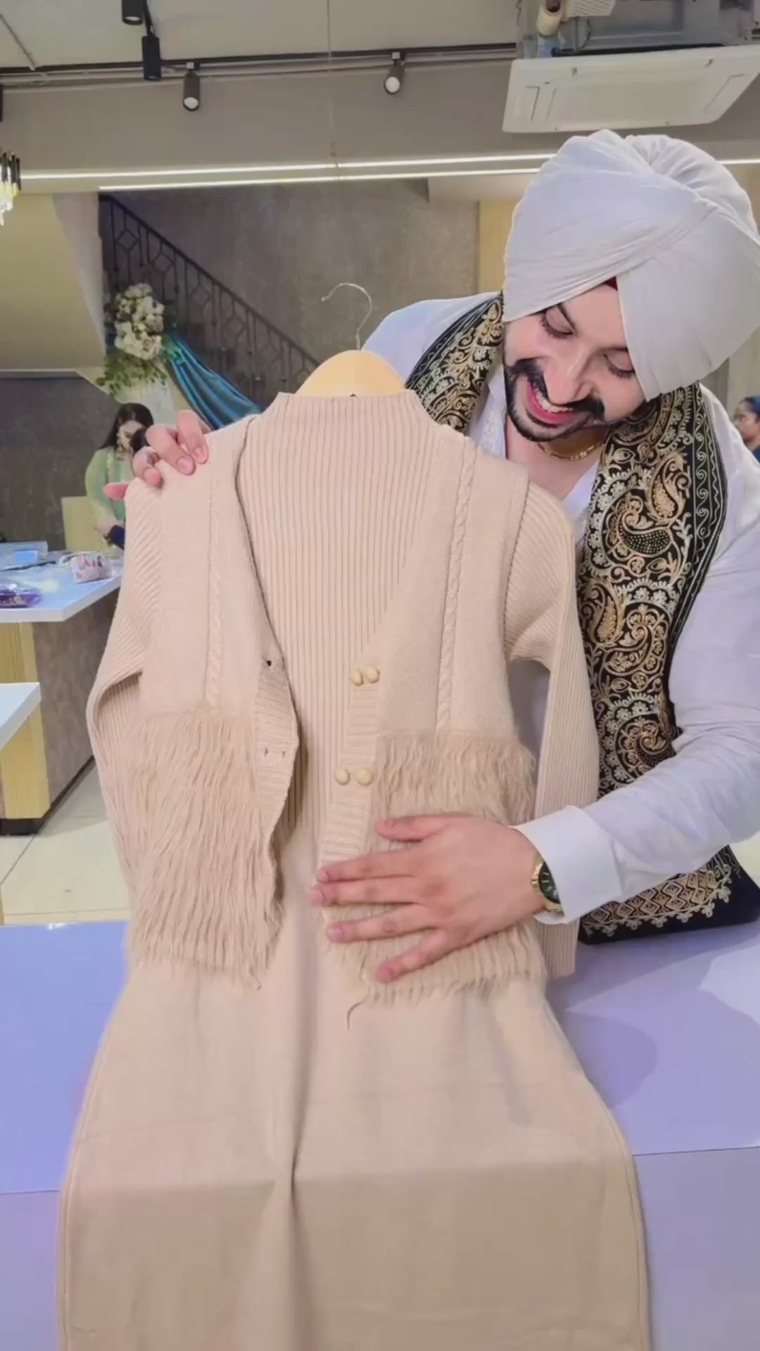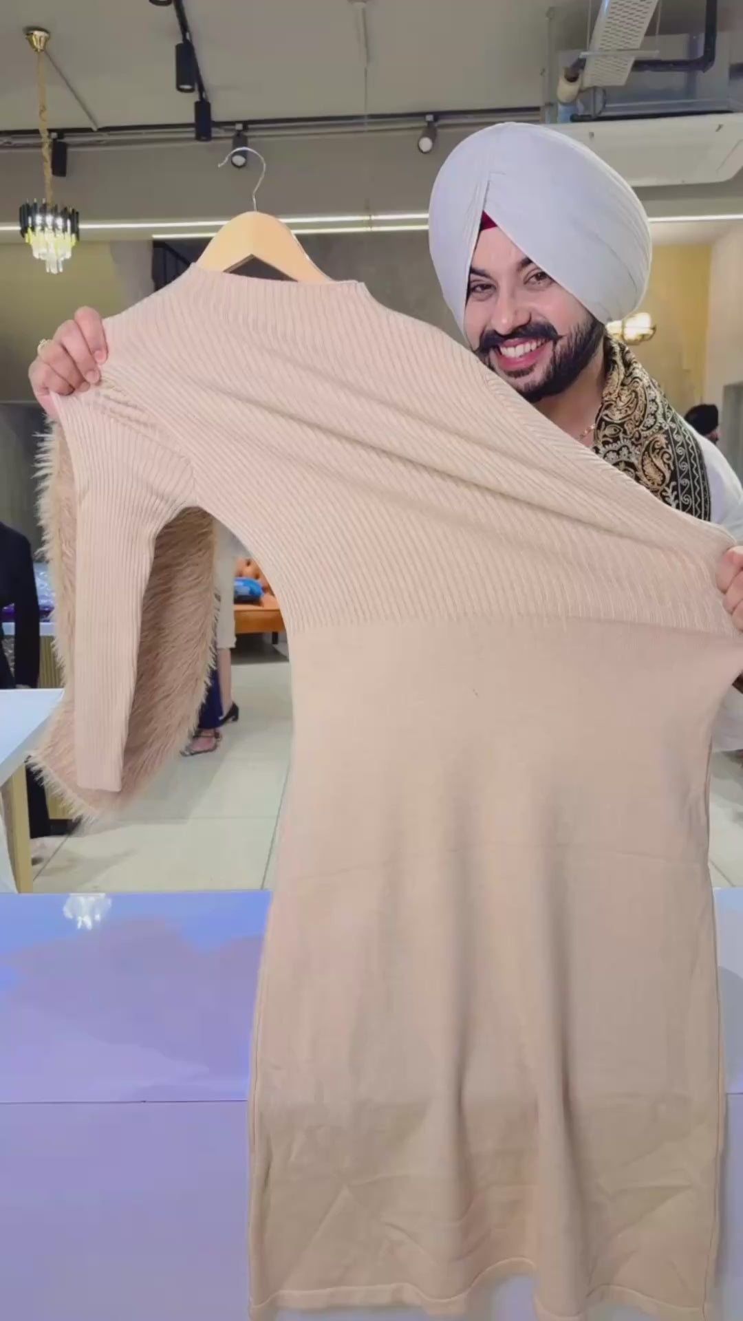 Beige knee length Imported wool Dress with Furr jacket