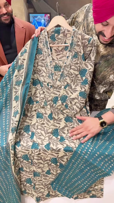 Beige & Rama Green Pure Cotton Office Wear Suit with Sleek Hand embroidery Work on Neck