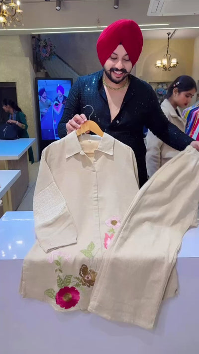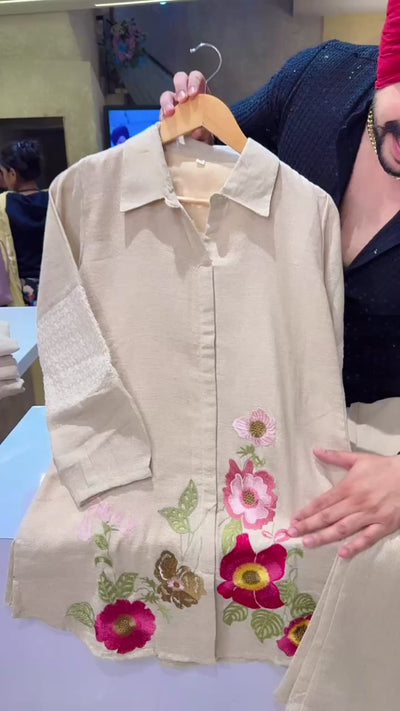 Beige Soft Jute Cotton collar Neck Embroidered & Crochet lace Semiformal Coord set IN