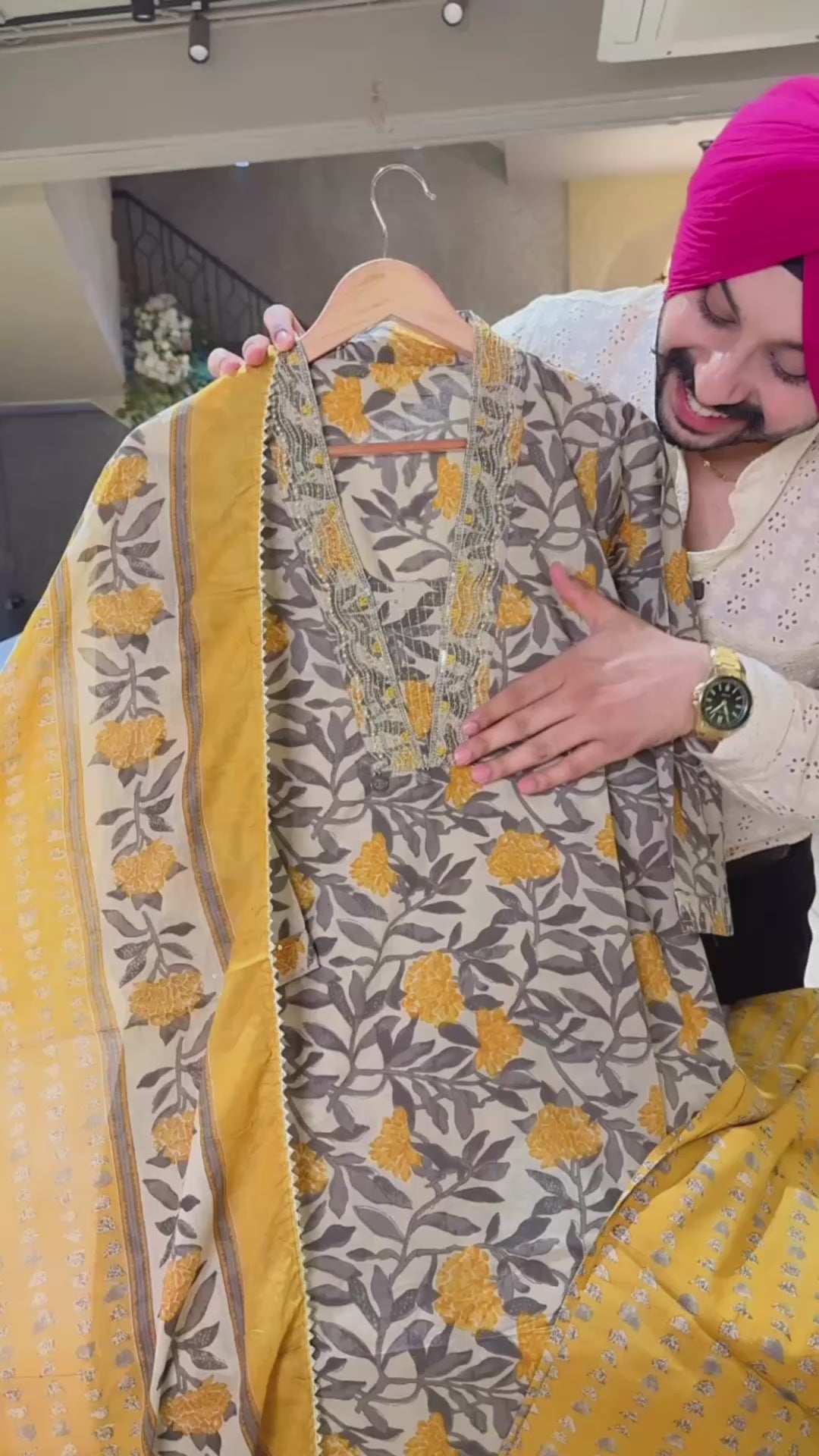 BeigeGrey & Mustard Pure Cotton Office Wear suit with Hand embroidery Work on neck