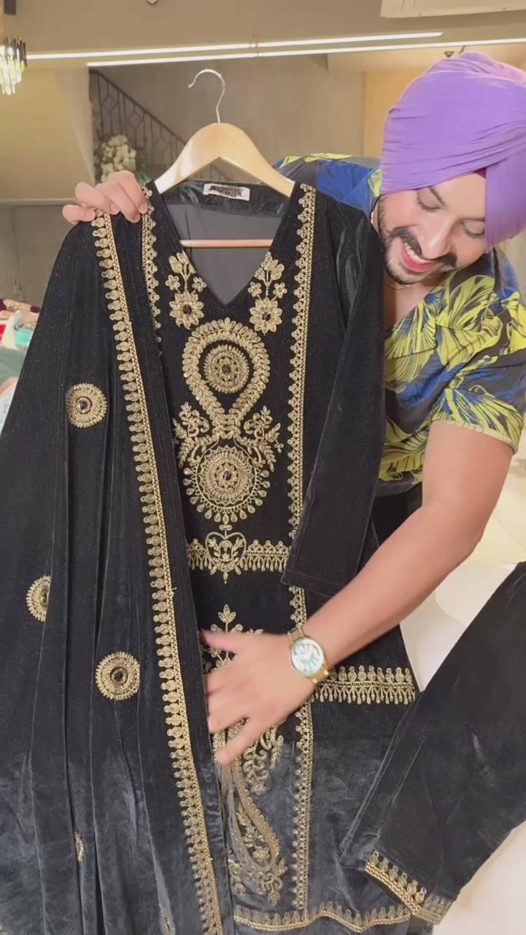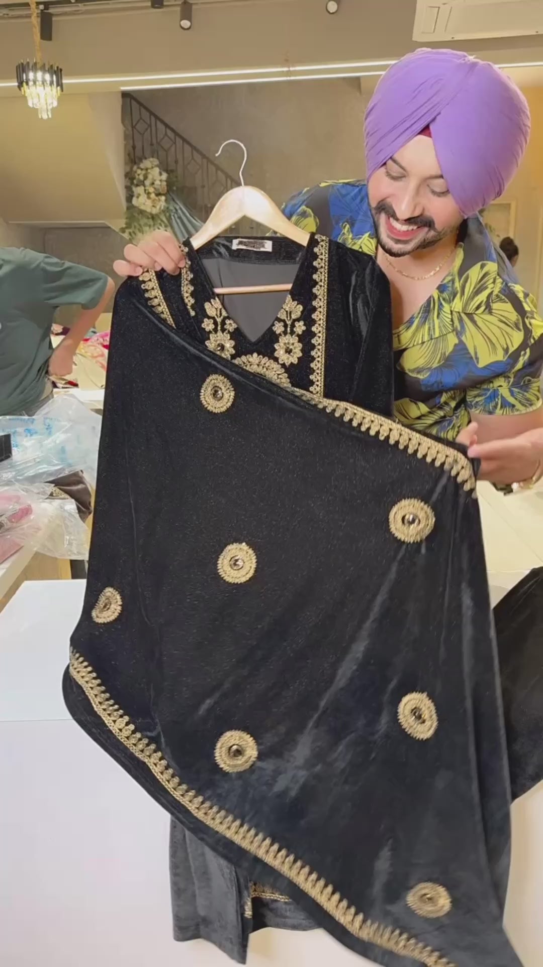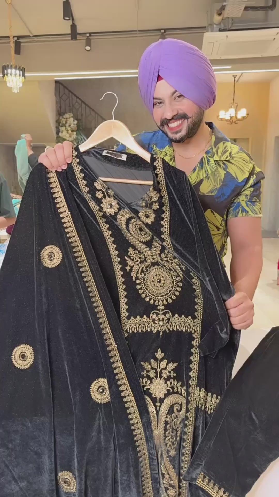 Black cotrise Velvet Strechable Straight Heavy embroidered Suit