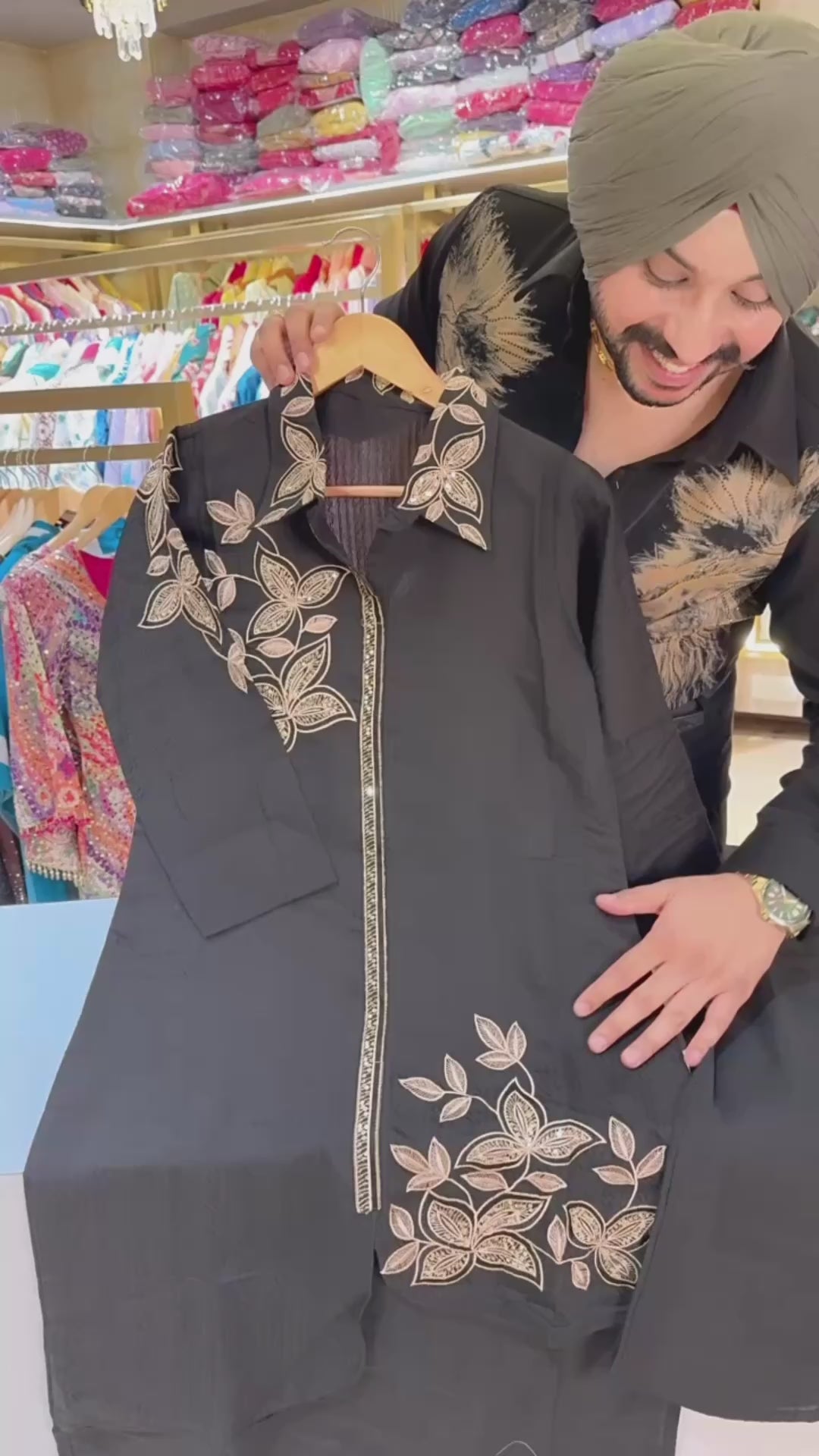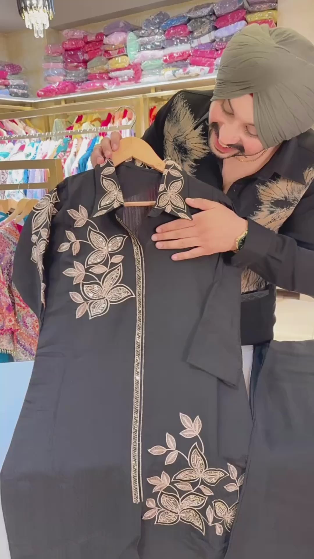 Black soft silk Collar Neck High low Long Length Coord set with Beautiful embroidery work over it