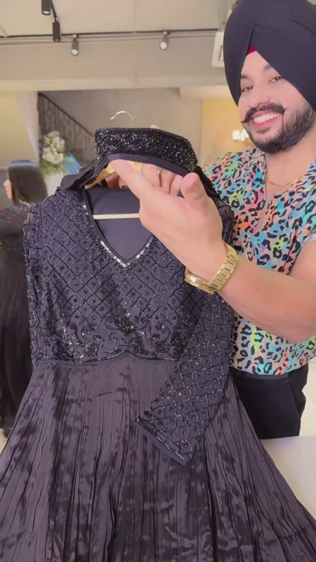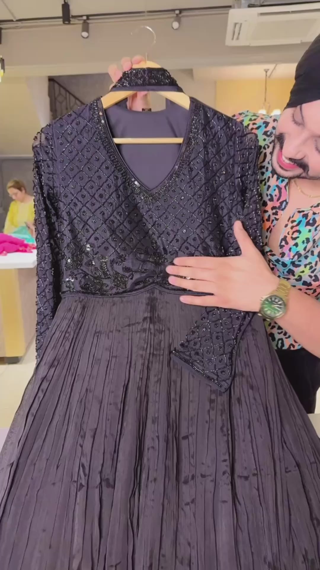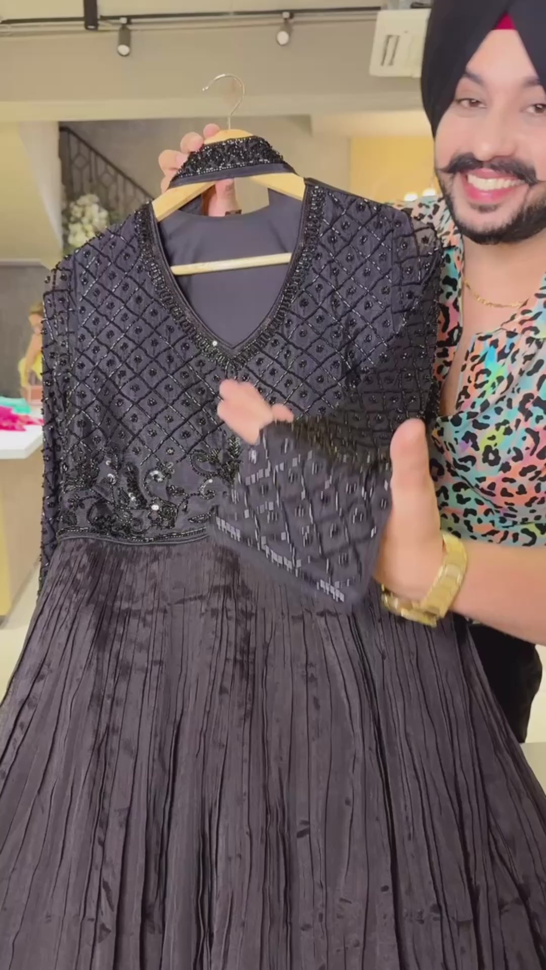 Black Crush Chinon Anarkali Gown With Heavy Hand Embroidery Work on Bust, Sleeves & Necklace Duppata