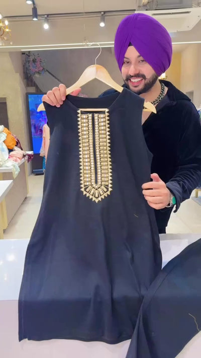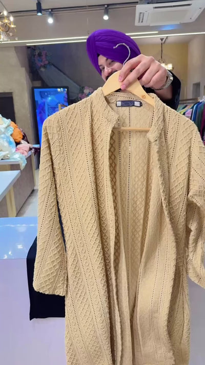 Black & Beige Woolen Long Length Embroidered Coord set with Stylish Shrug