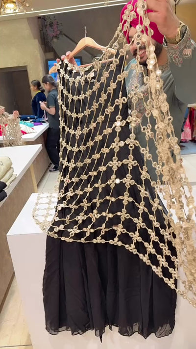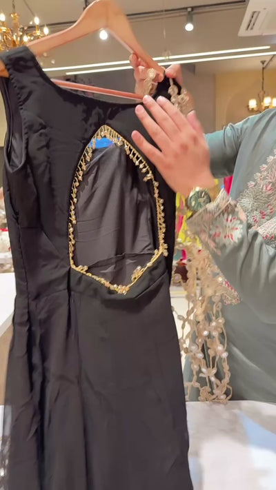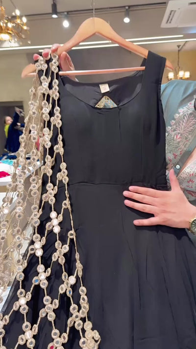 Black Georgette Backless Anarkali Gown with Heavy Designer Lace Duppata