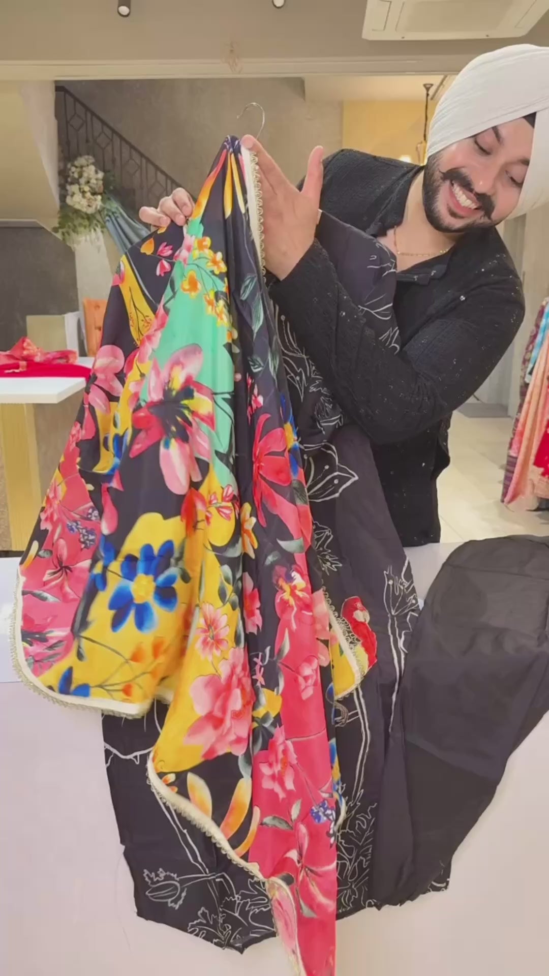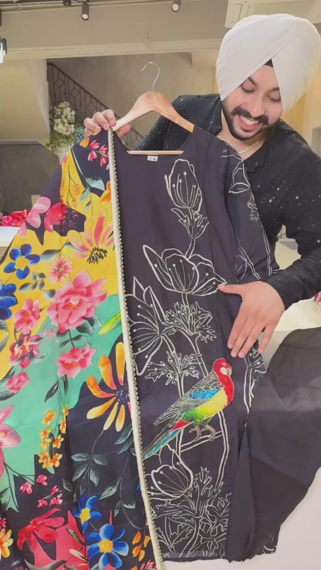 Black muslin silk Macaw print Straight Suit with beautiful Foral print Duppata