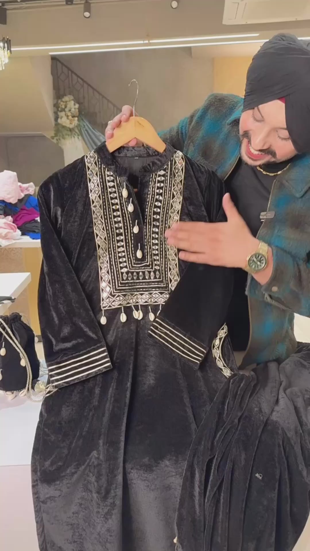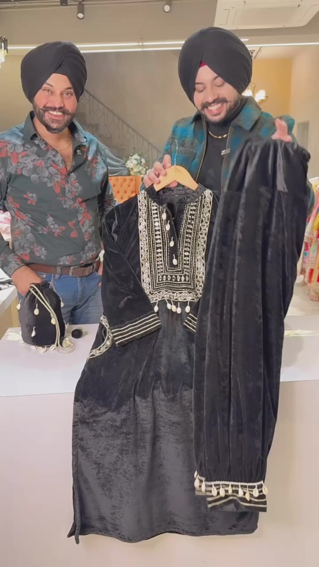 Black Premium velvet Mirror work Pathani Coord set with Potli