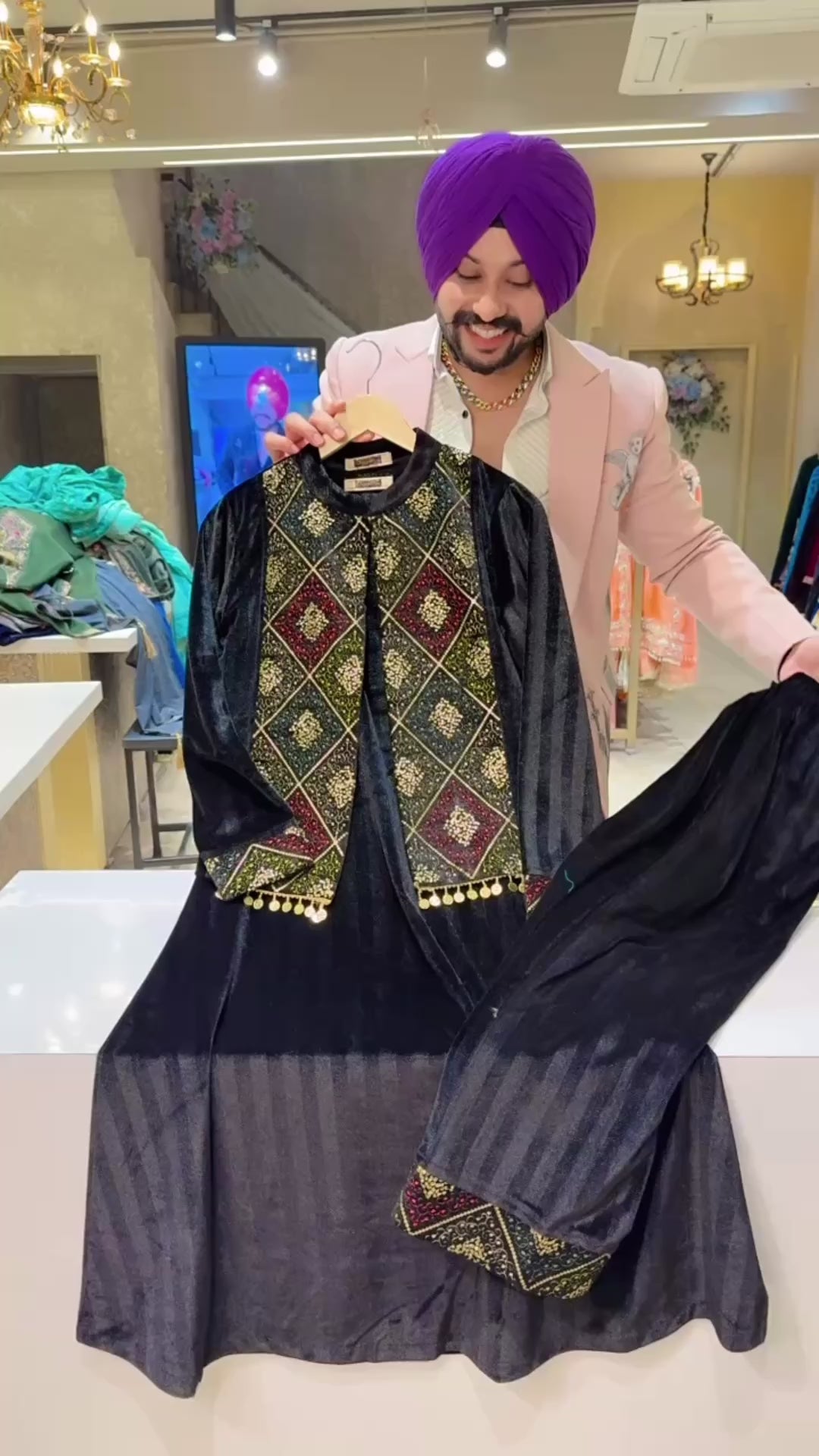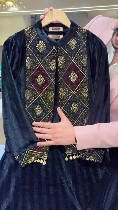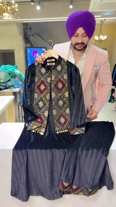 Black Strechable Velvet long Length A-line Coord set with Heavy embroidered & sequins Work Short Jacket