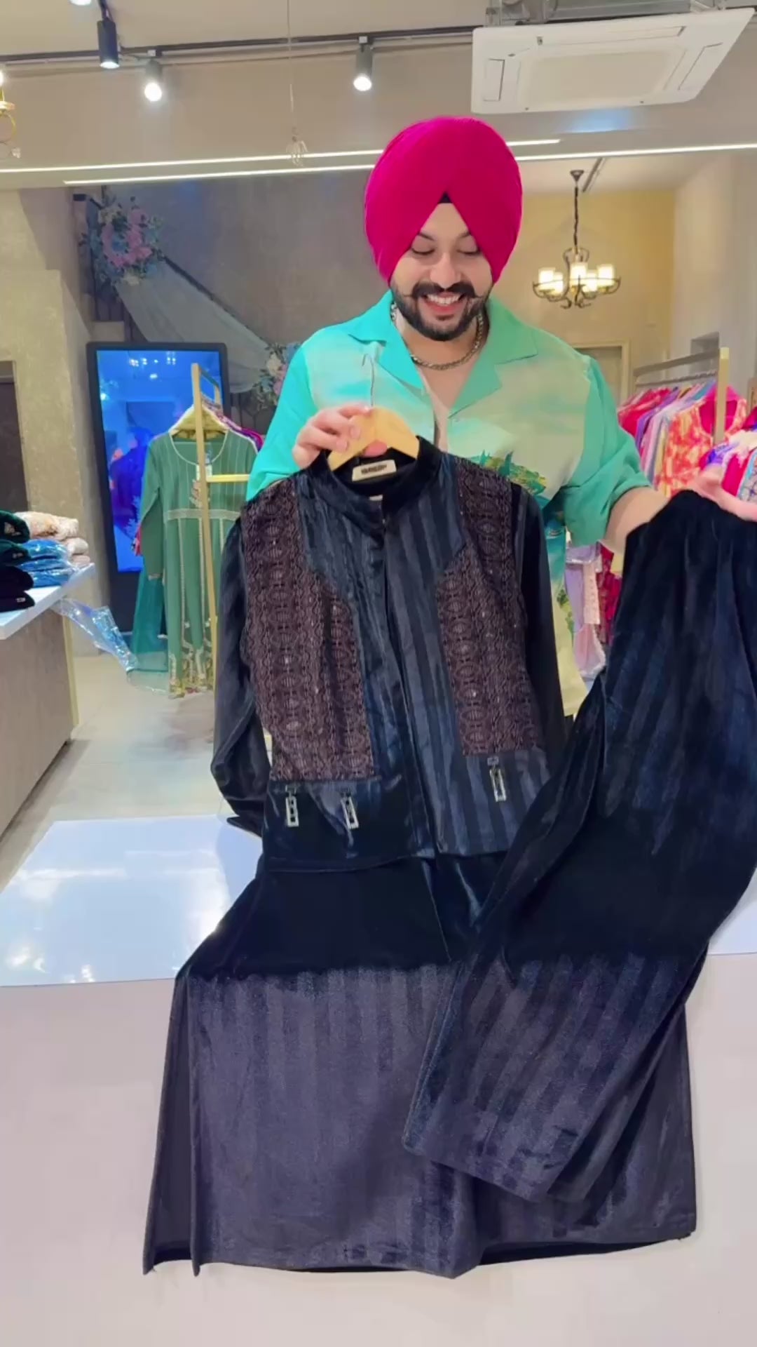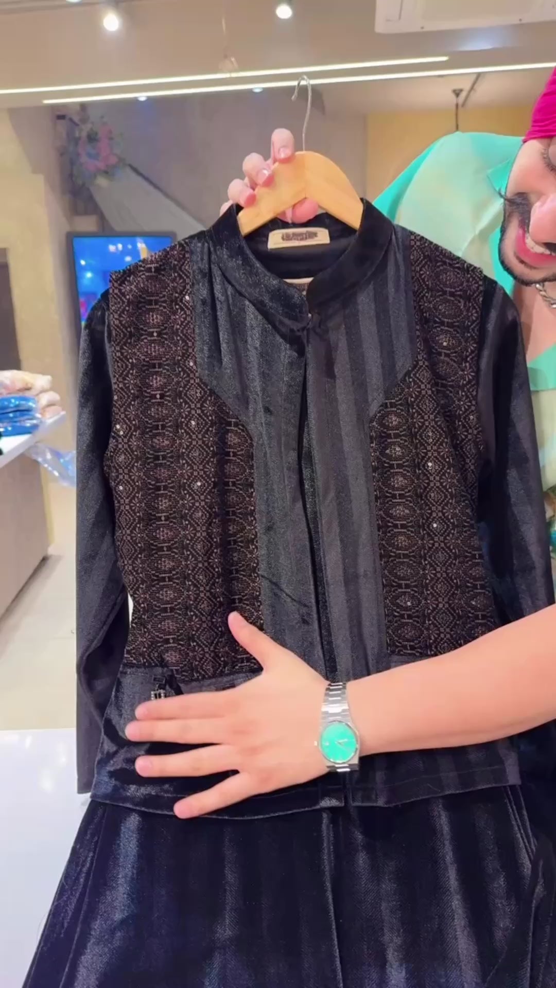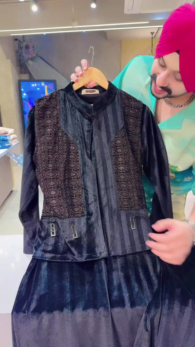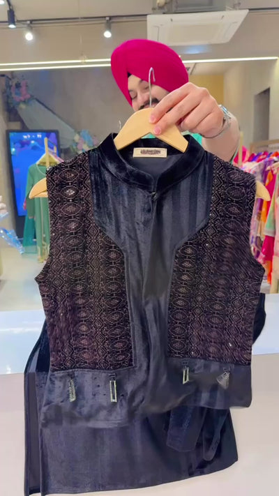 Black Stretchable Velvet Partywear Long length Coord set with Embroidered Short Jacket