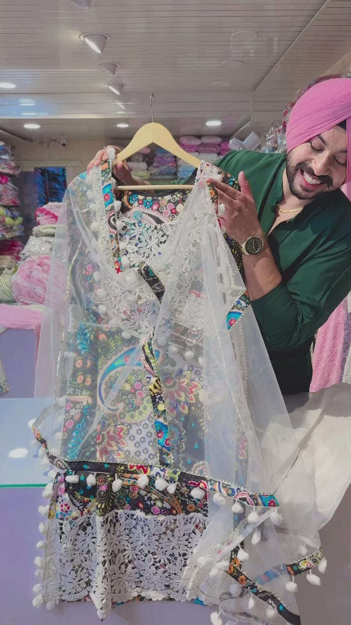 Black Stylish Pure Cotton Pompom Suit with Beautiful Crochet lace work