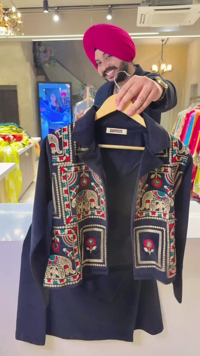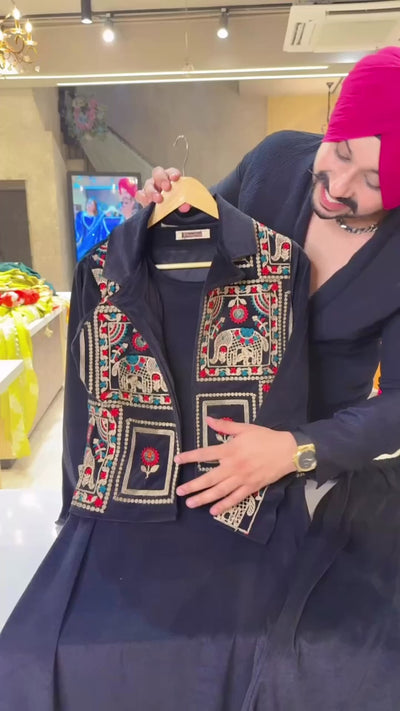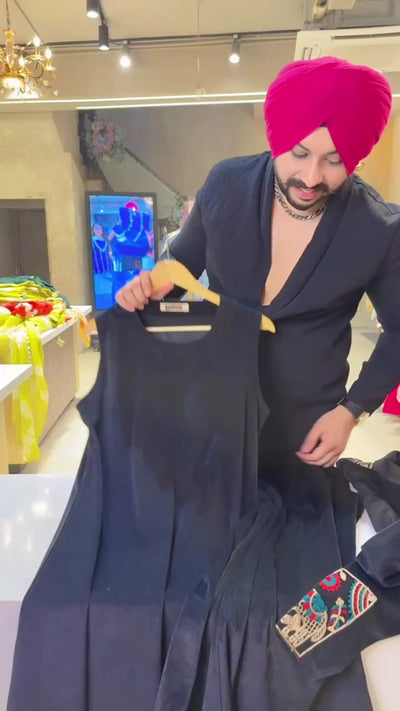 Black Velvet A-line Long Length Coord set with Collar Neck Embroidered Short Jacket