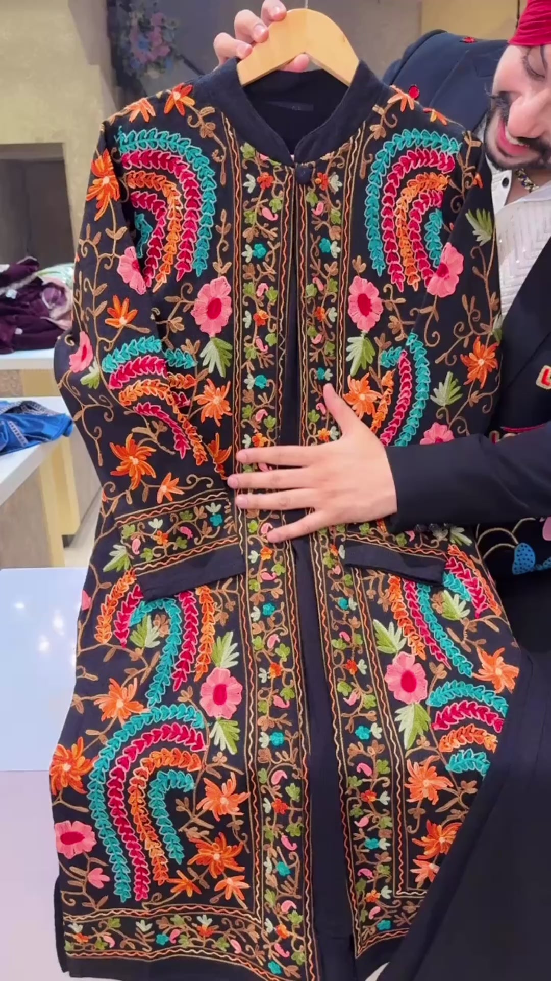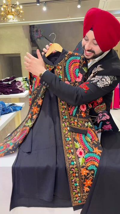 Black Woolen Long length Coord set With Heavy Kashmiri Embroidered Shrug