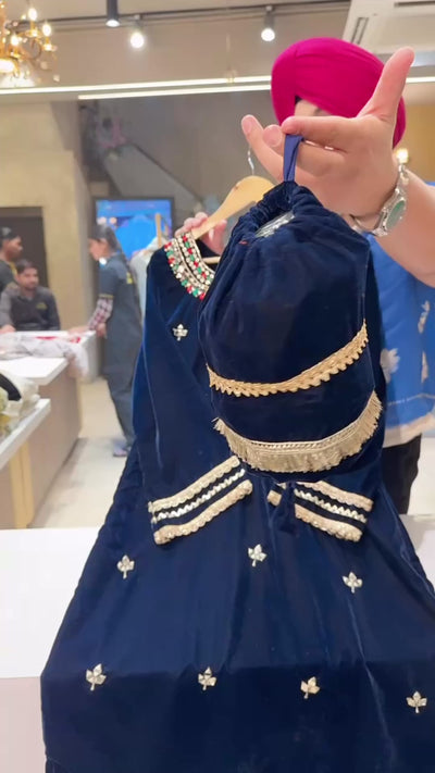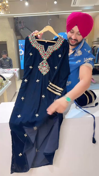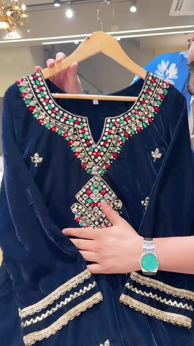 Dark Blue Velvet Heavy mirror Embroidered Long Straight Side slit Dress with Cute Potli