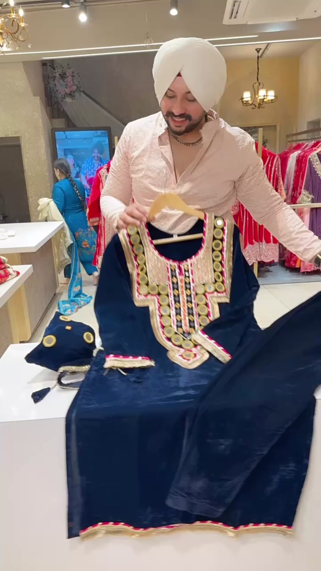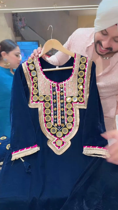 Dark Blue Vevet heavy Mirror & Gotta Work Long Length Coord set with Cute Potli