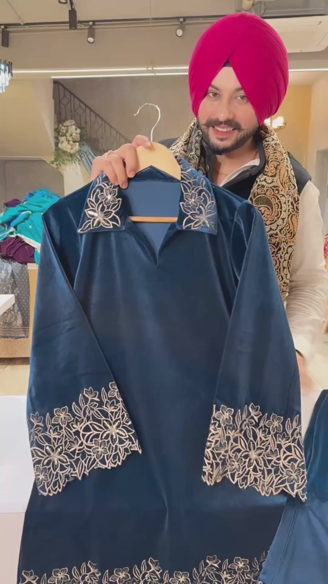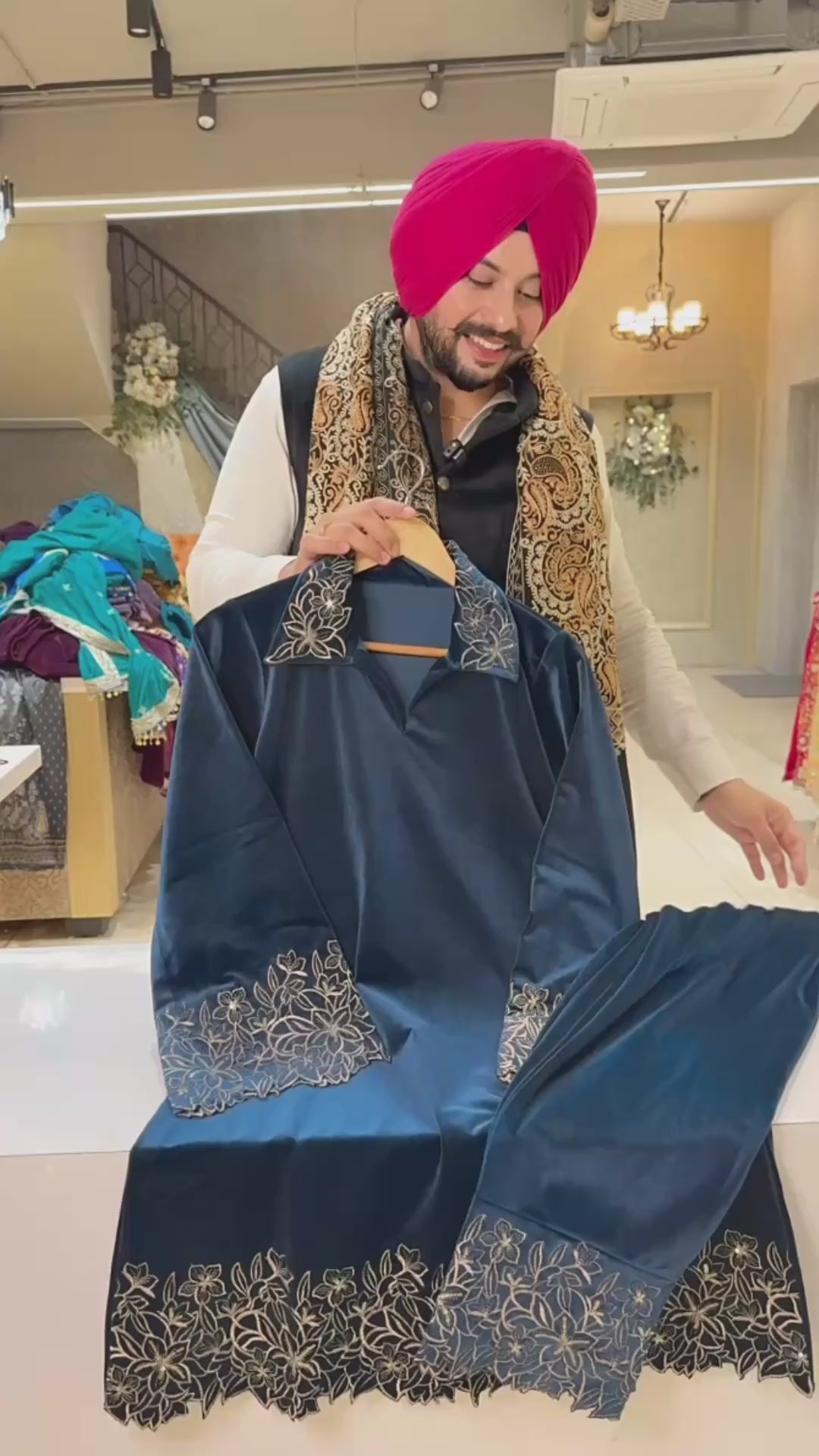 Blue Heavy Strechable Velvet Collar neck Pakistani Coord set with Heavy Embroidery Work on it