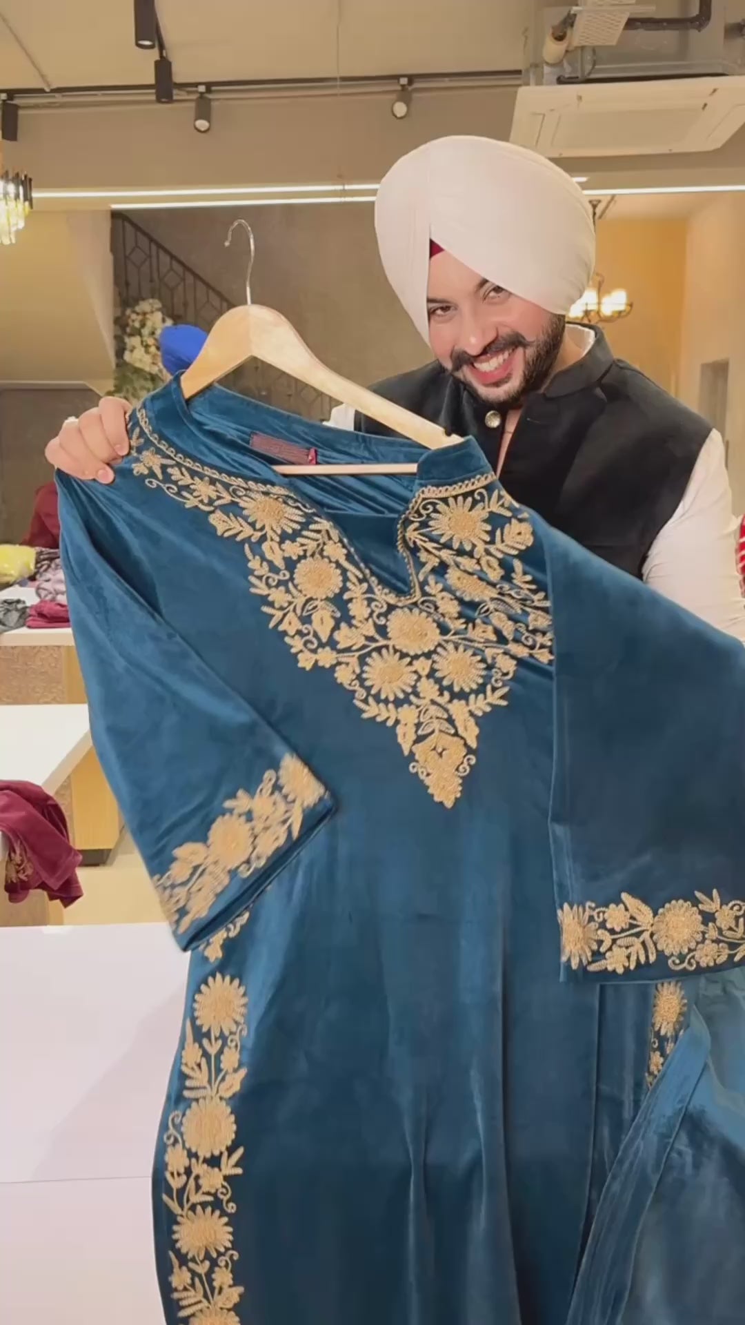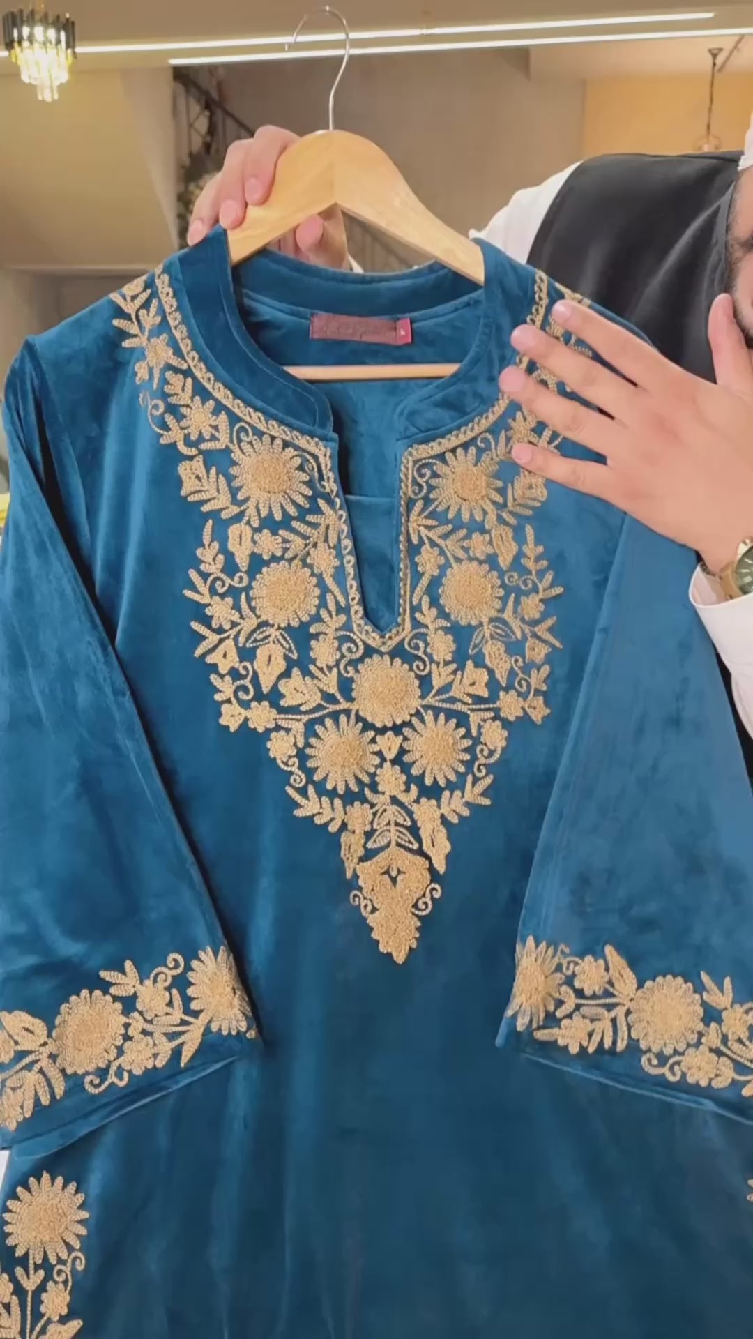 Teel Blue Heavy Strechable Velvet Embroidered Kashmiri Phiran Coord set
