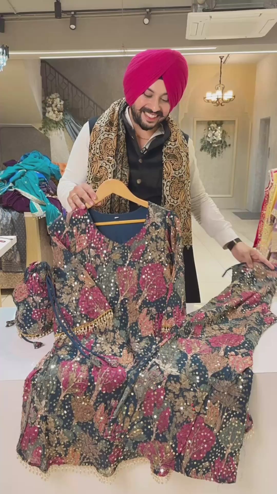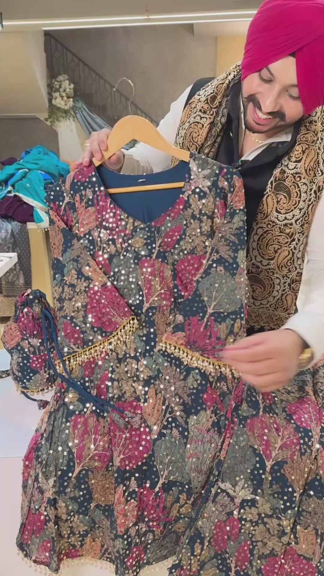 Blue & multicolored Georgette Fully Sequence Work Paplum BellBottom Coord set with Cute Potli