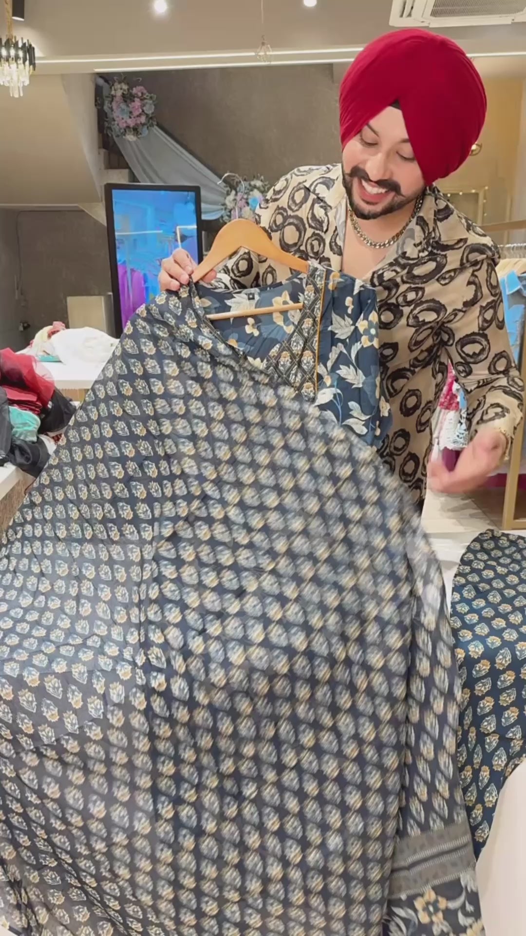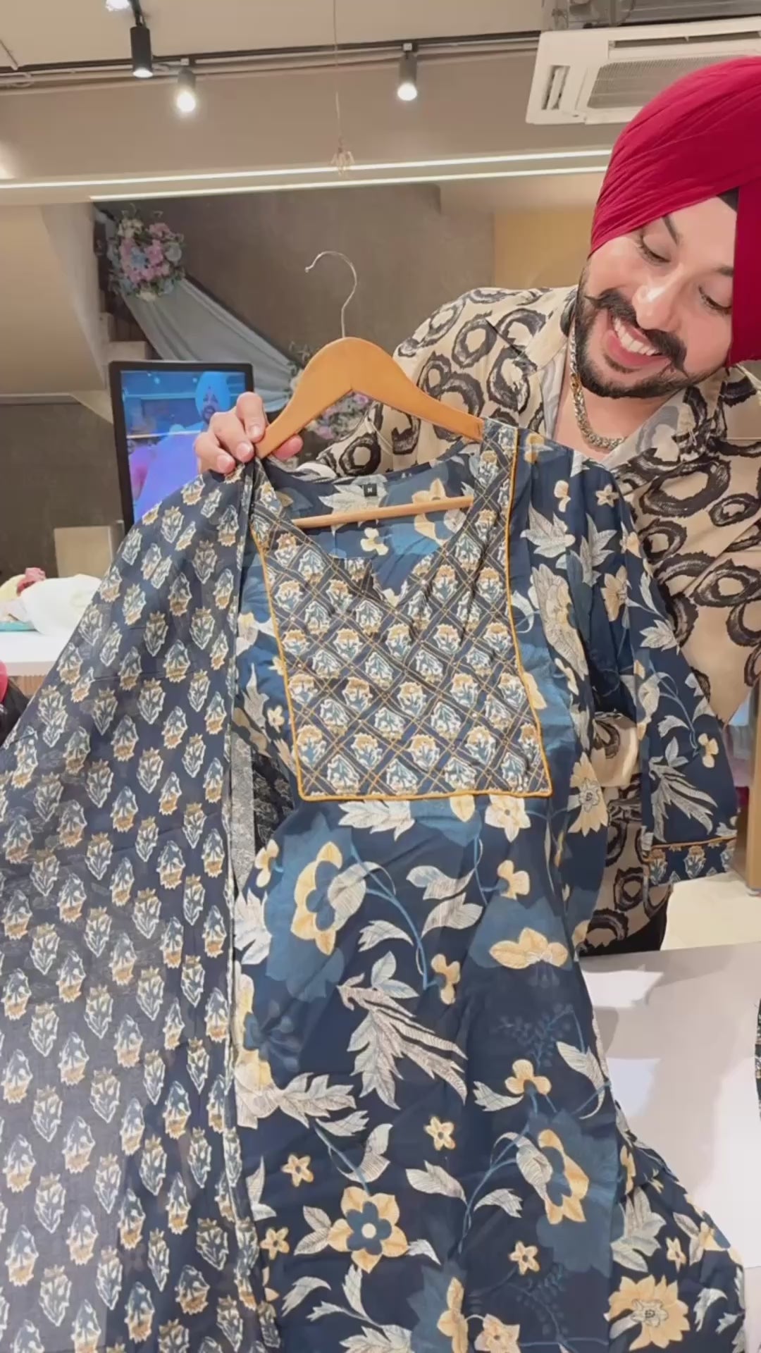 Blue pure Cotton Office Wear Straight Suit with sleek Embroidery work on neck