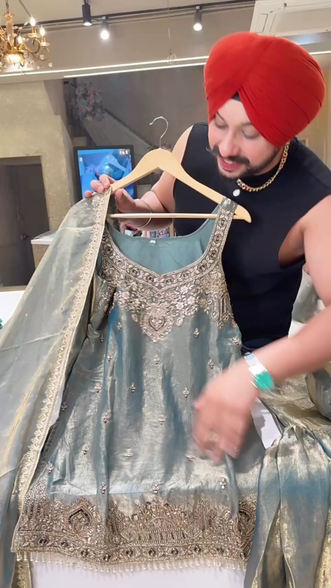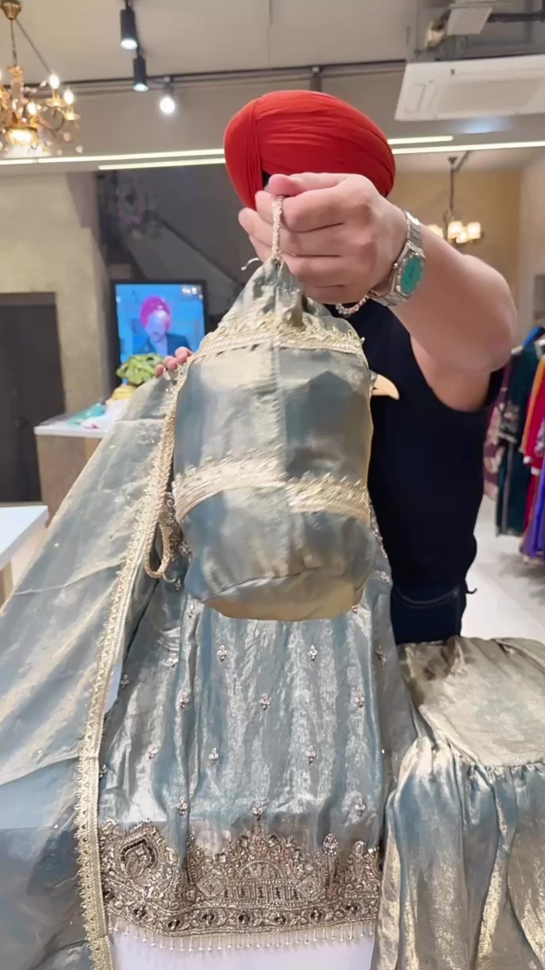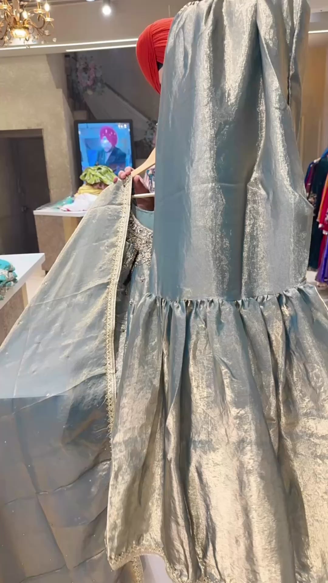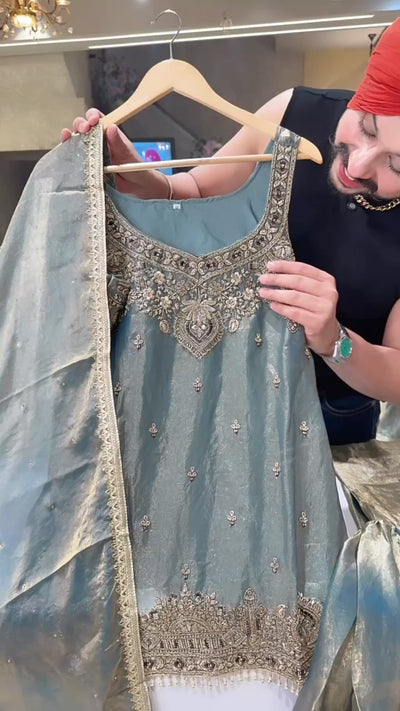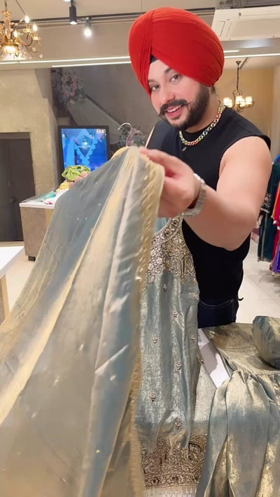 Blueish Grey Crush Shimmer Tissue Heavy Hand Embroidered Garara Suit