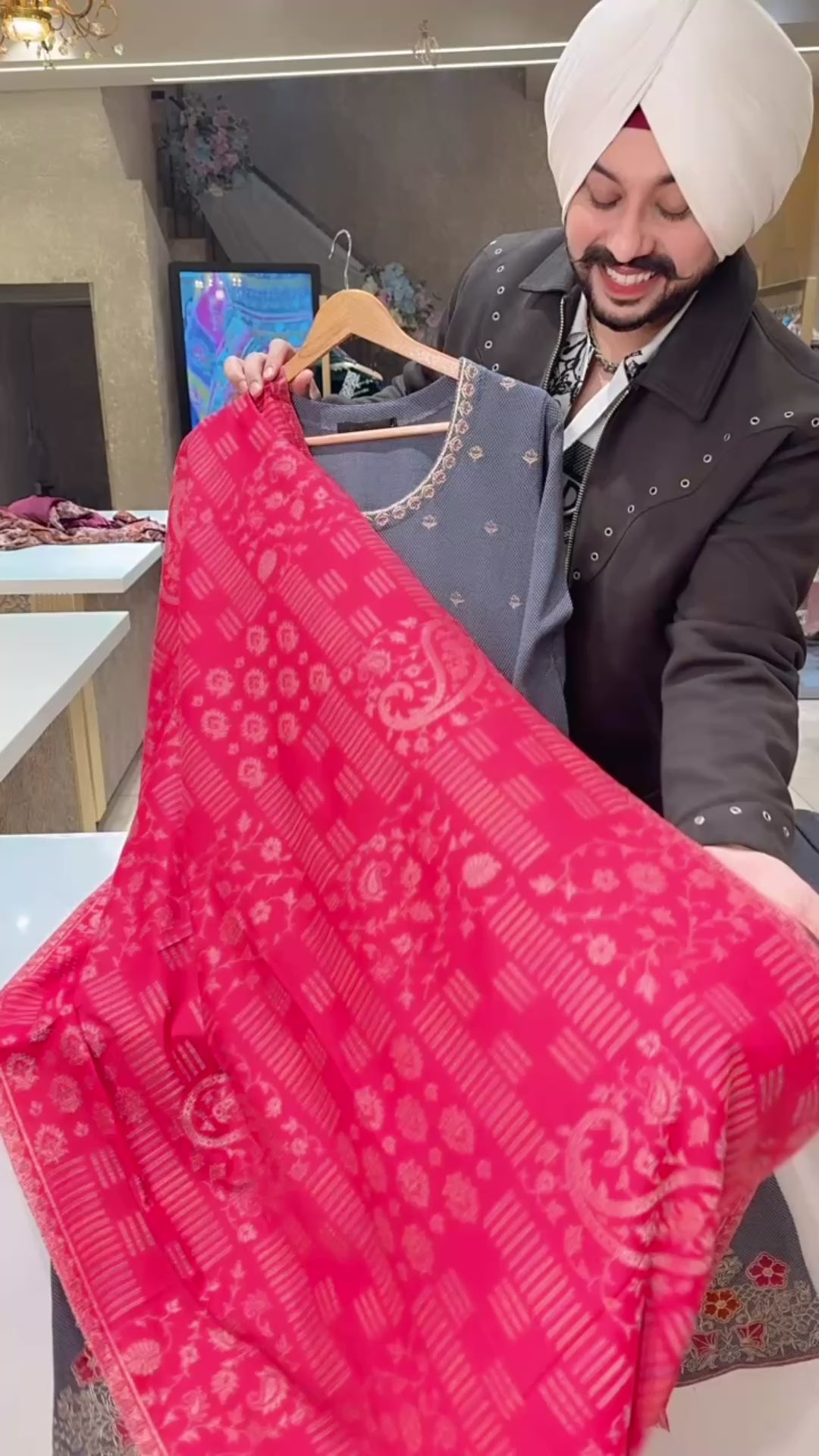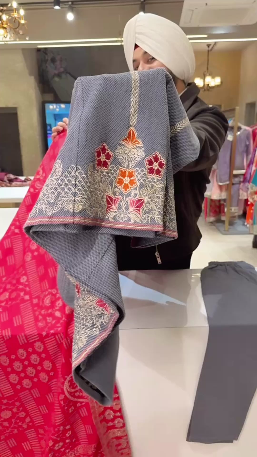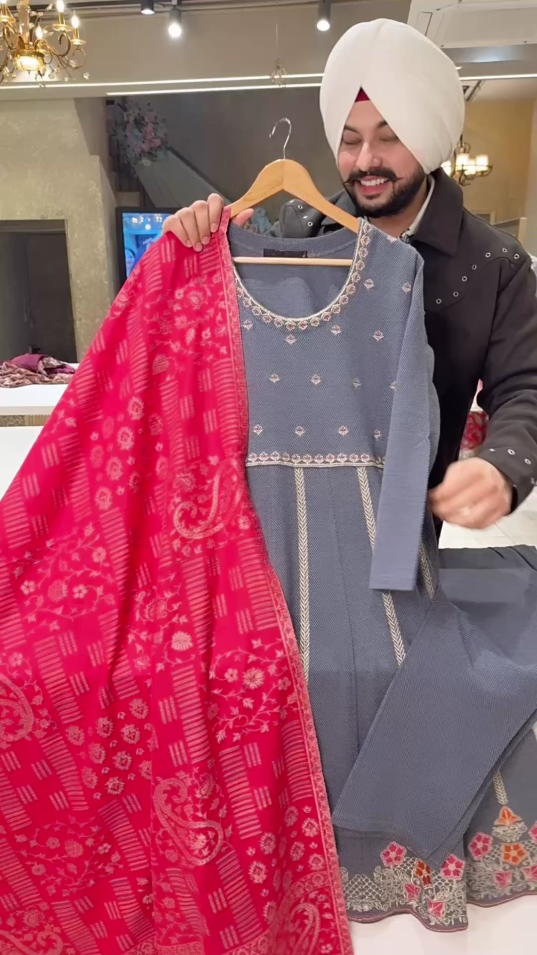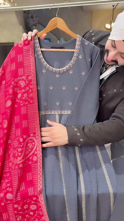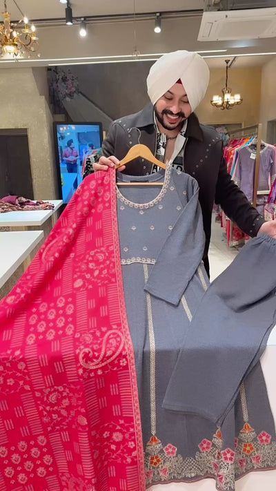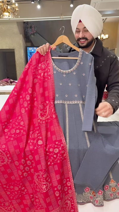 Blueish Grey Embroidered Woolen Anarkali Suit with Beautiful Pink Banarsi Duppata