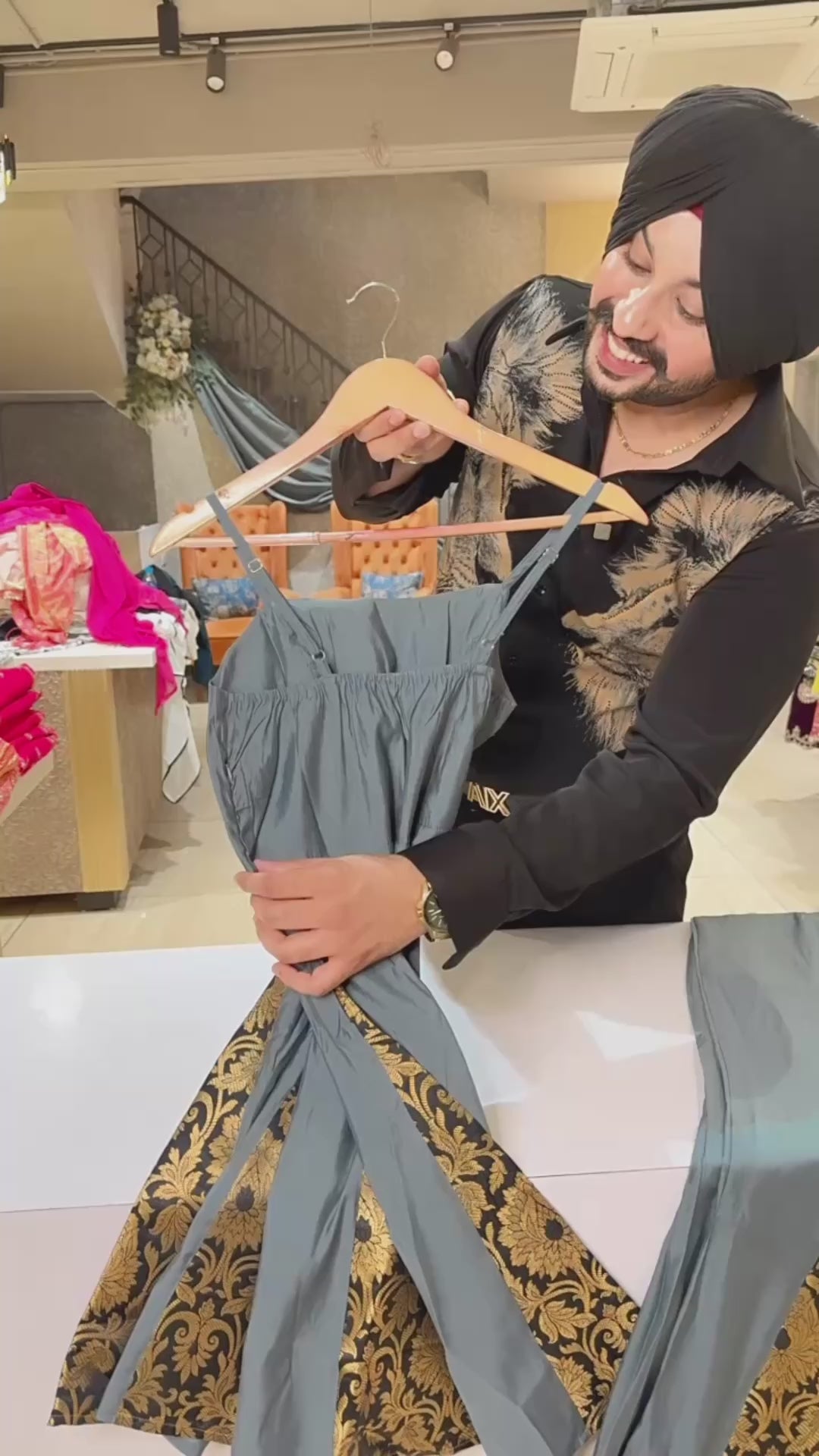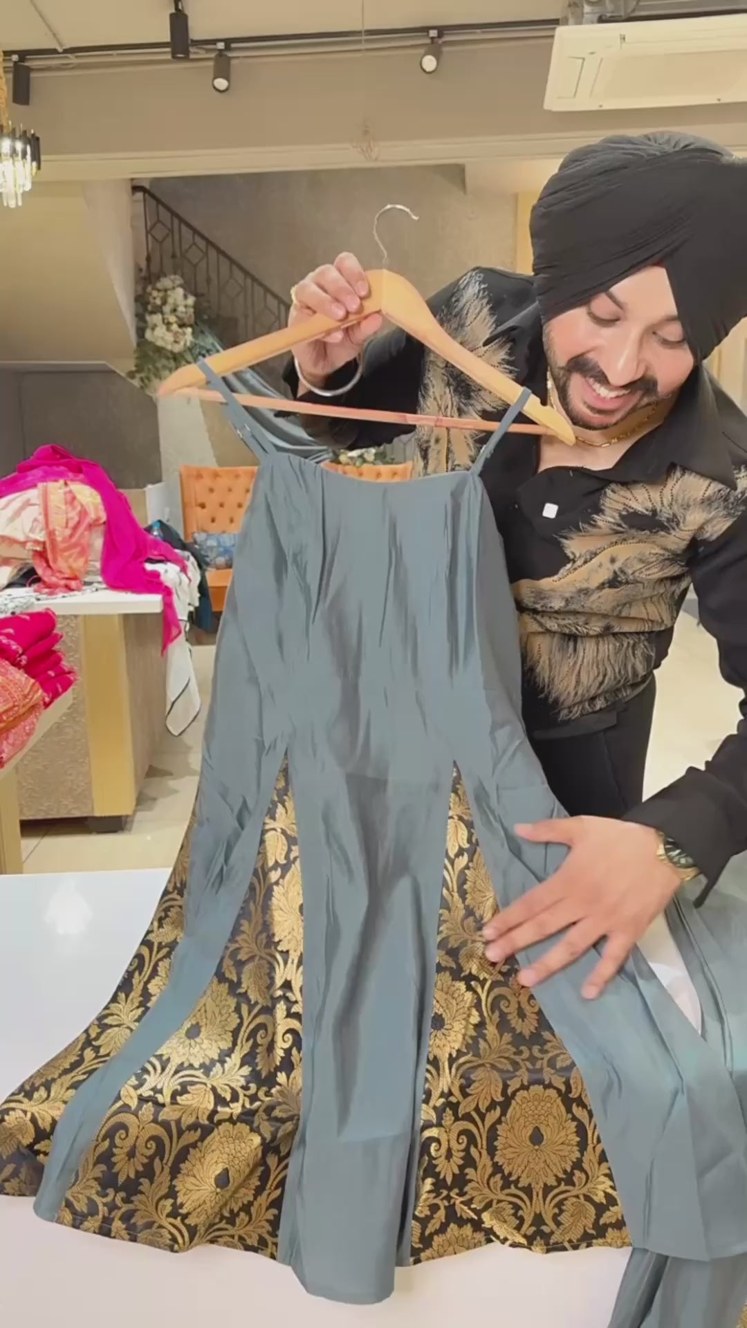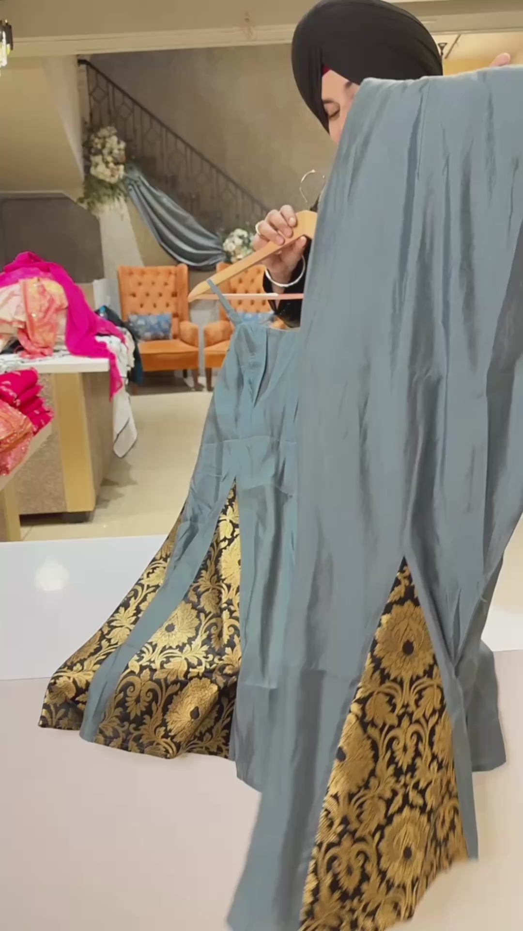 Blueish Grey Soft Silk Noodle Sleeves Paplum Bell bottom Coord set with Brocade Patchwork