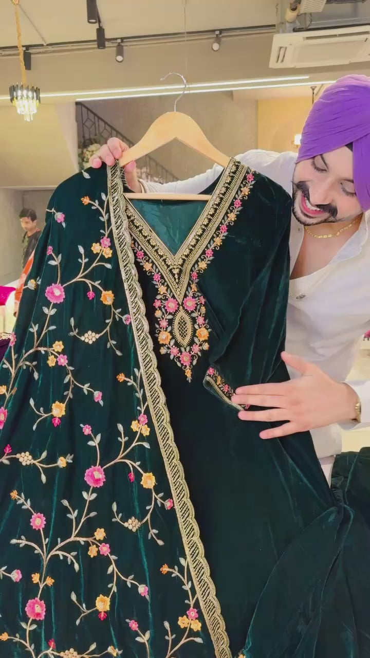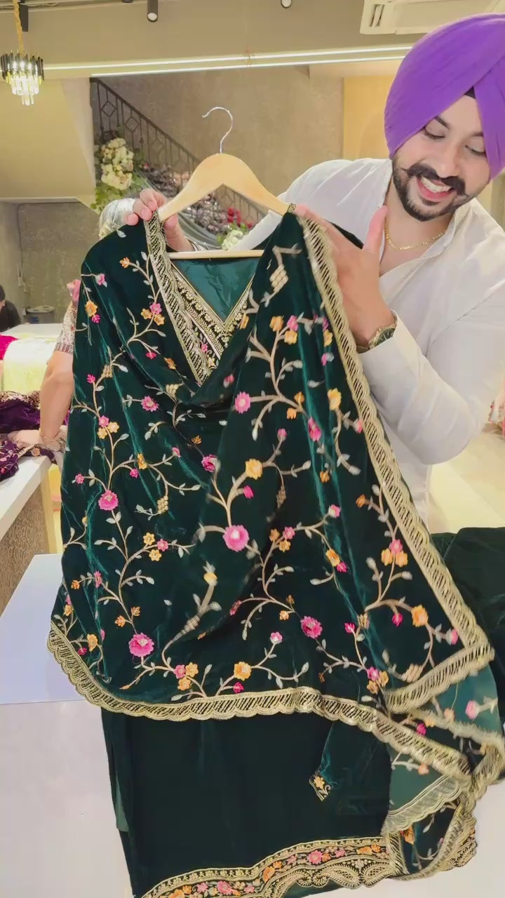 Bottle green Velvet Pakistani Suit with Heavy Embroidered Duppata