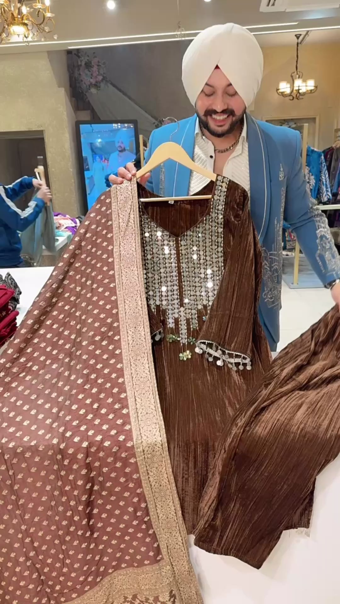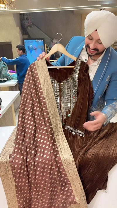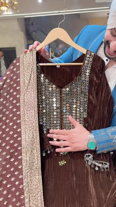 Chocolate brown Crush Velvet Heavy mirror Work Straight Suit with Beautiful Banarasi Look Duppata