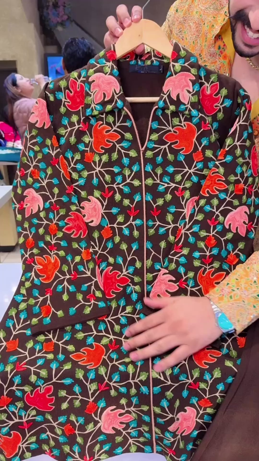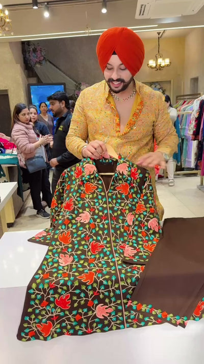 Dark Brown premium Woolen Collar Neck Heavy Kashmiri Embroidered long Length Coord set