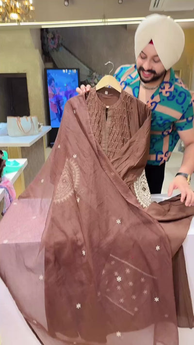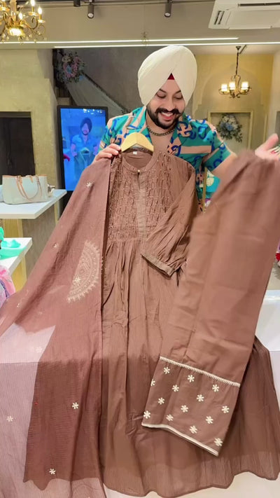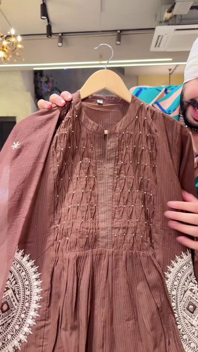 Chocolate Brown Colour Pure Cotton Designer embroidered A-line Suit with Beautiful Kota Doria Duppata