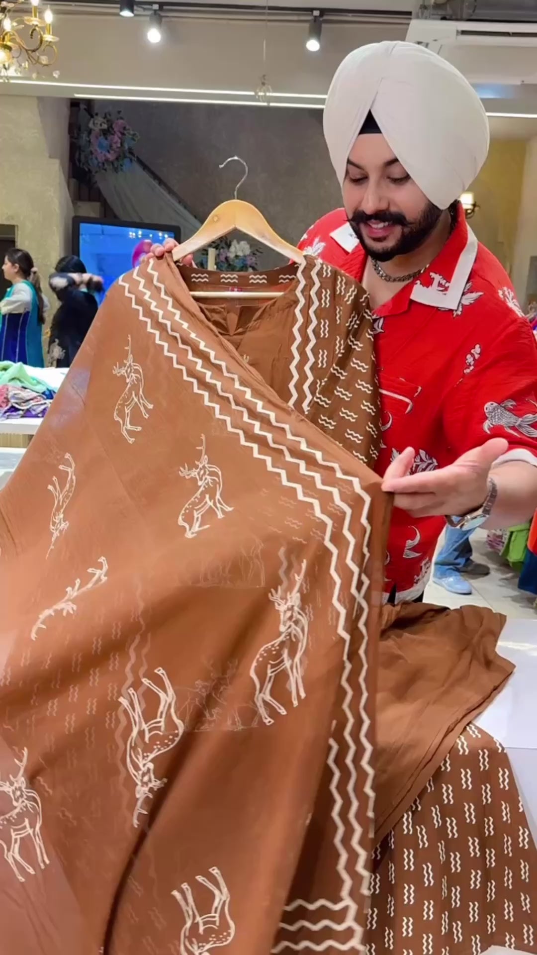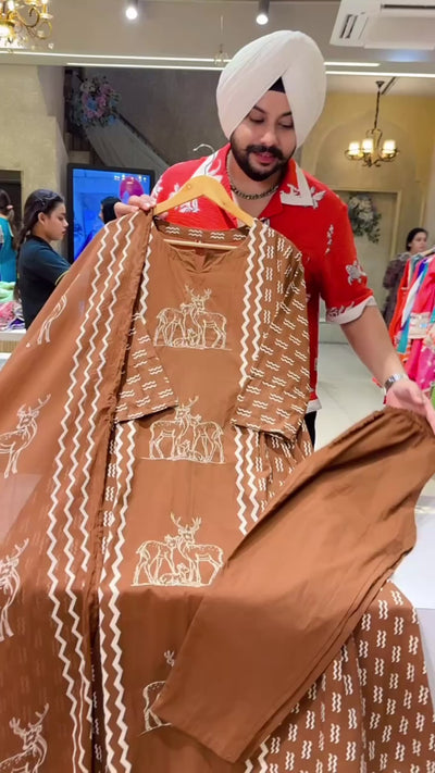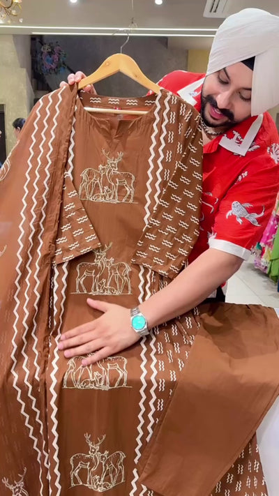 Chocolate Brown Deer Print Soft Cotton A-line Hand Embroidered Indowestern Suit