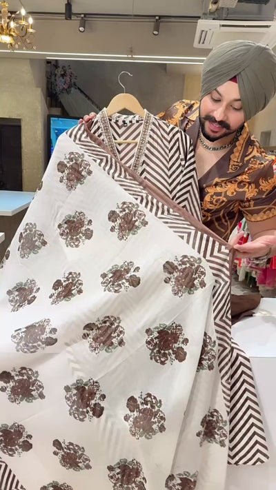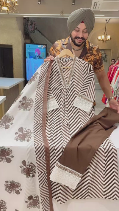 Chocolate Brown Pure Cotton A-line Office Wear Suit with Sleek Embroidery work on neck