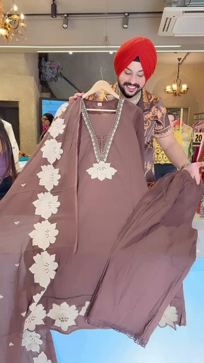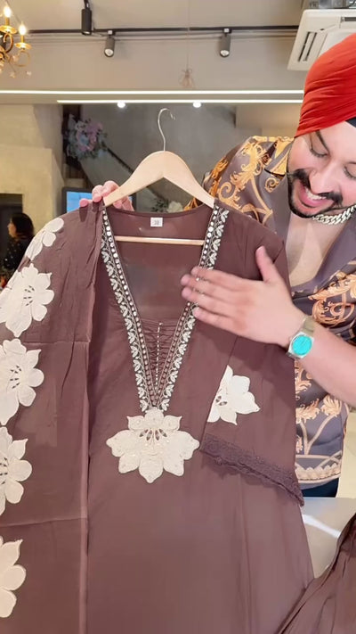 Chocolate Brown Pure Cotton Designer neck Floral Embroidered Straight Suit with hand painted Duppata