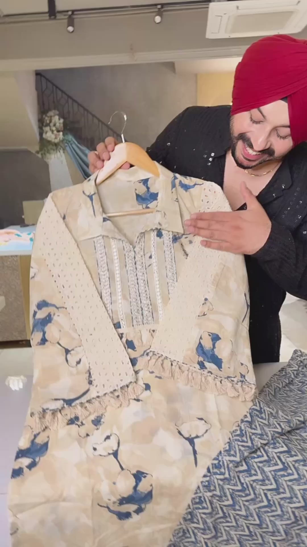 Cream & Blue Collar Neck Bell Bottom Coord set with Embroidery & Shifli Work on it