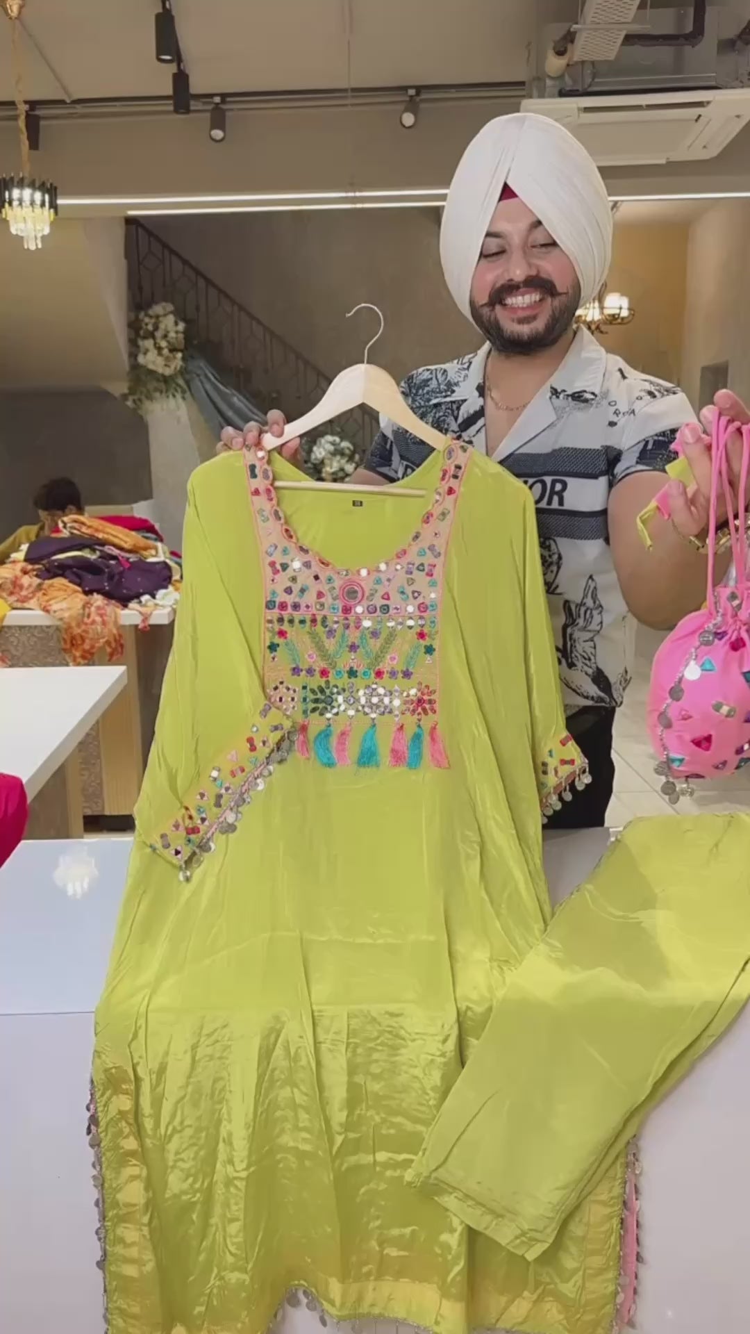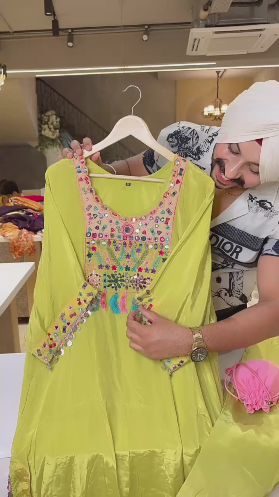 fluorescent Green Kashmiri Phiran Coord set with Mirror work on neck & cute Potli