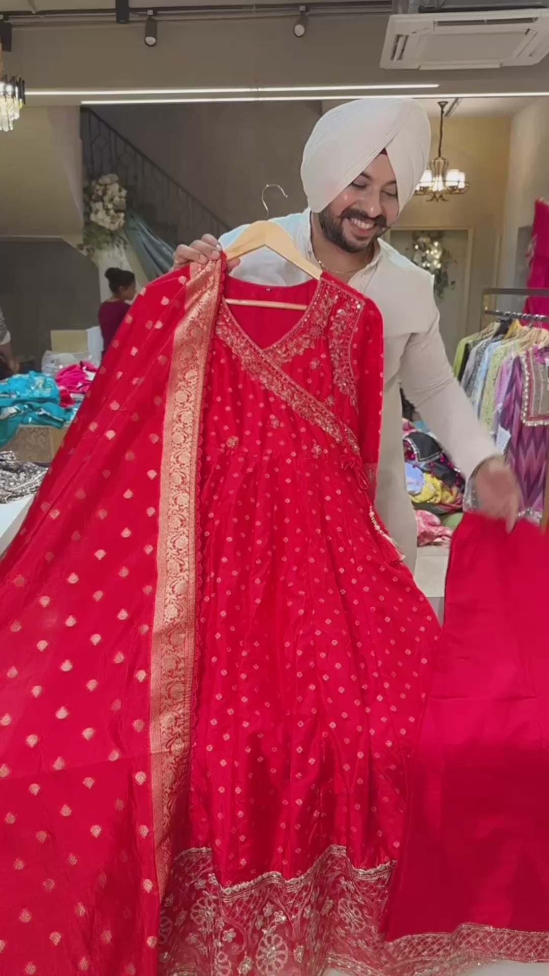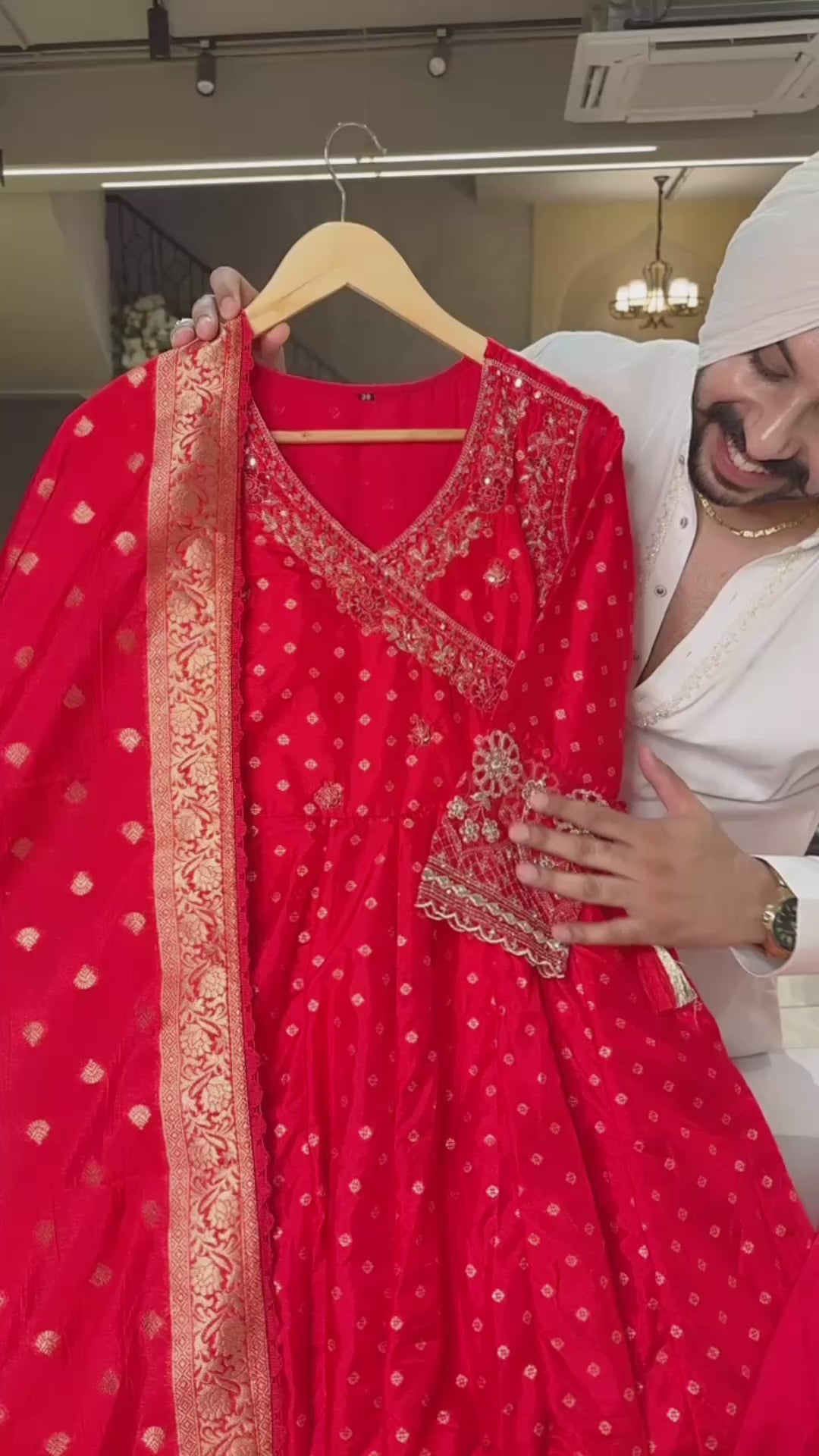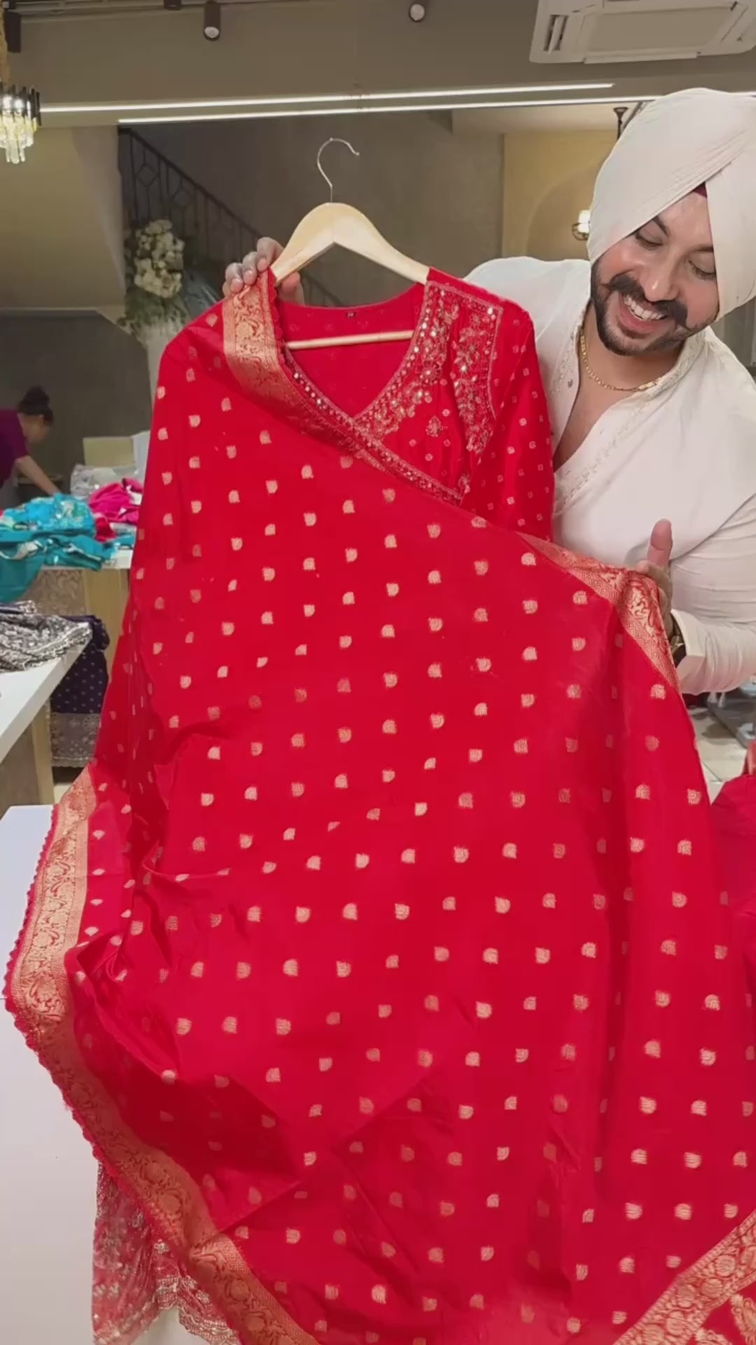 Vibrant Red Soft silk Angrakha Anarkali Sharara Suit with Banarasi Duppata