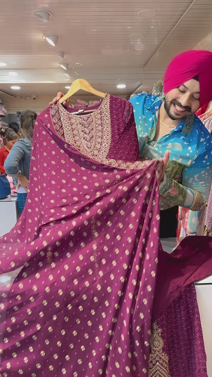 Wine Georgette Fully embroidered Anarkali suit with beautiful Chinon Duppata.