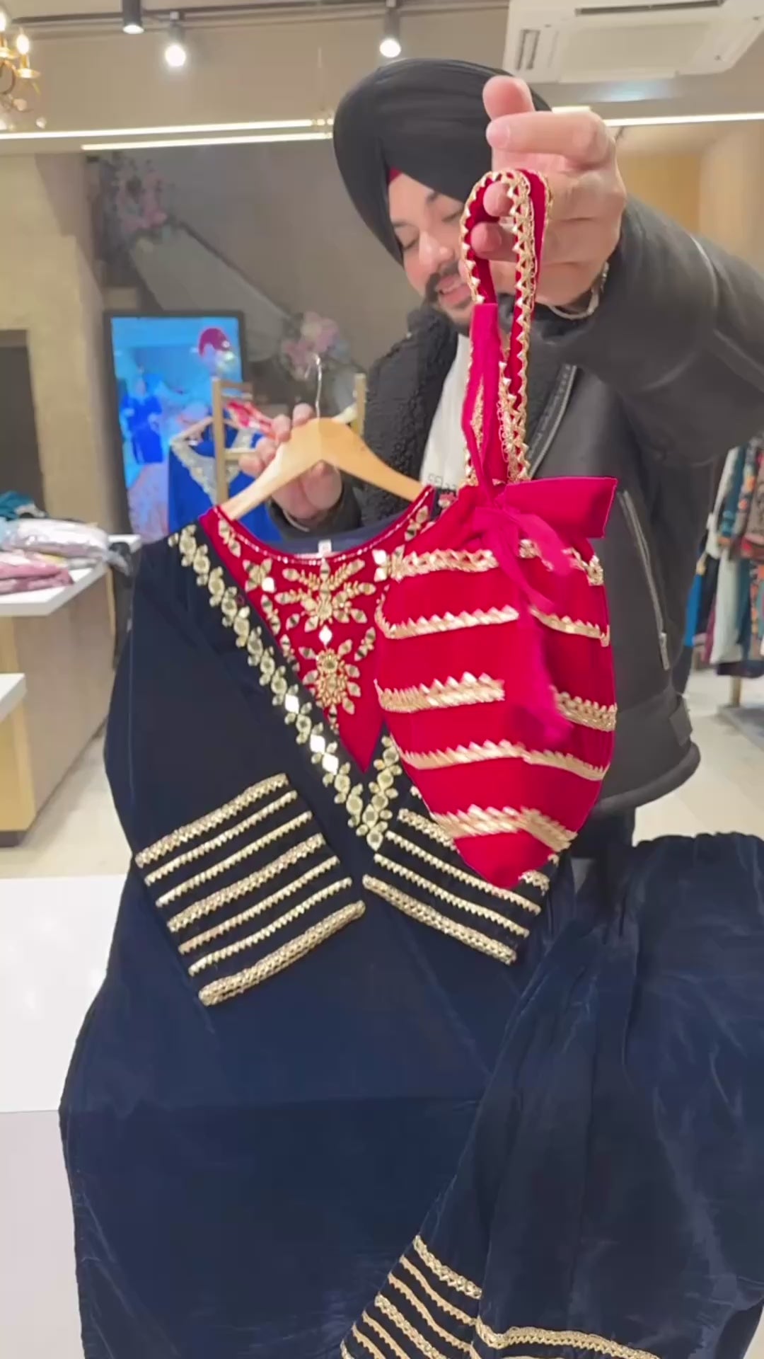 Dark Blue & Rani Velvet Embroidered & Mirror Work Long length Coord set with Stylish Bustier & Cute Potli