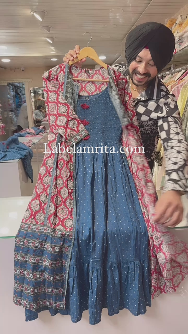 Denim blue Pure Cotton Indowestern dress with Kalamkari print stylish Shrug