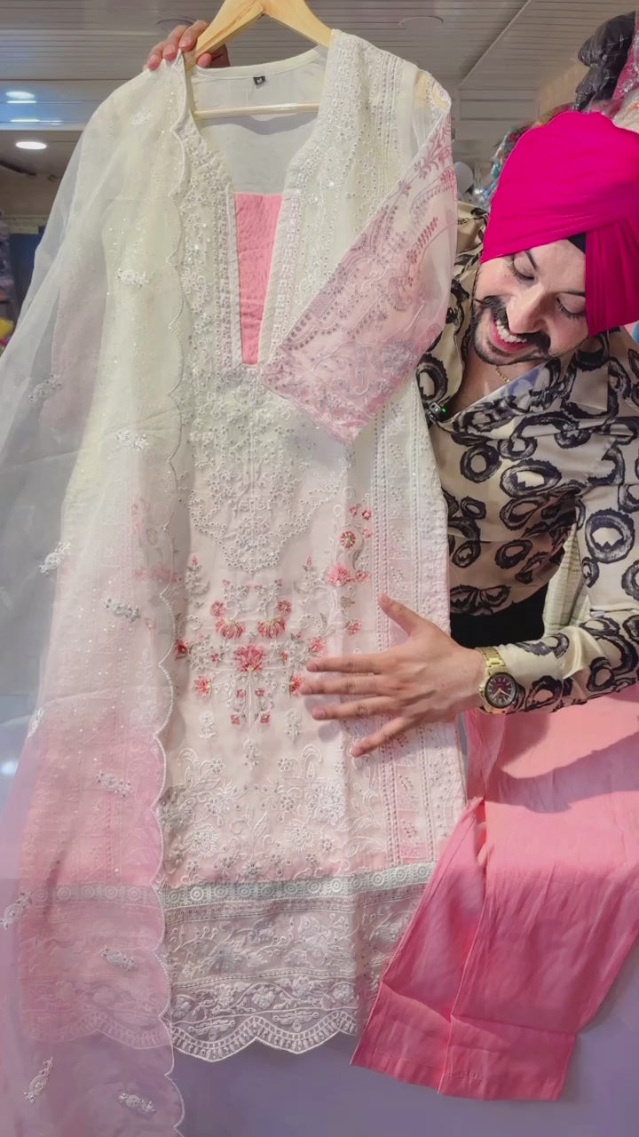 Moonwhite & pink Organza Pakistani heavy Embroidered Suit