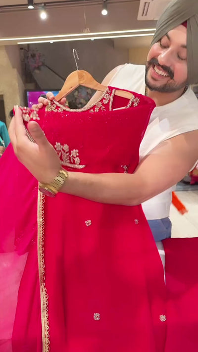 Rani Pink Georgette Party Wear Straight Suit With Hand embroidery Work on Designer Neck & Sleeves