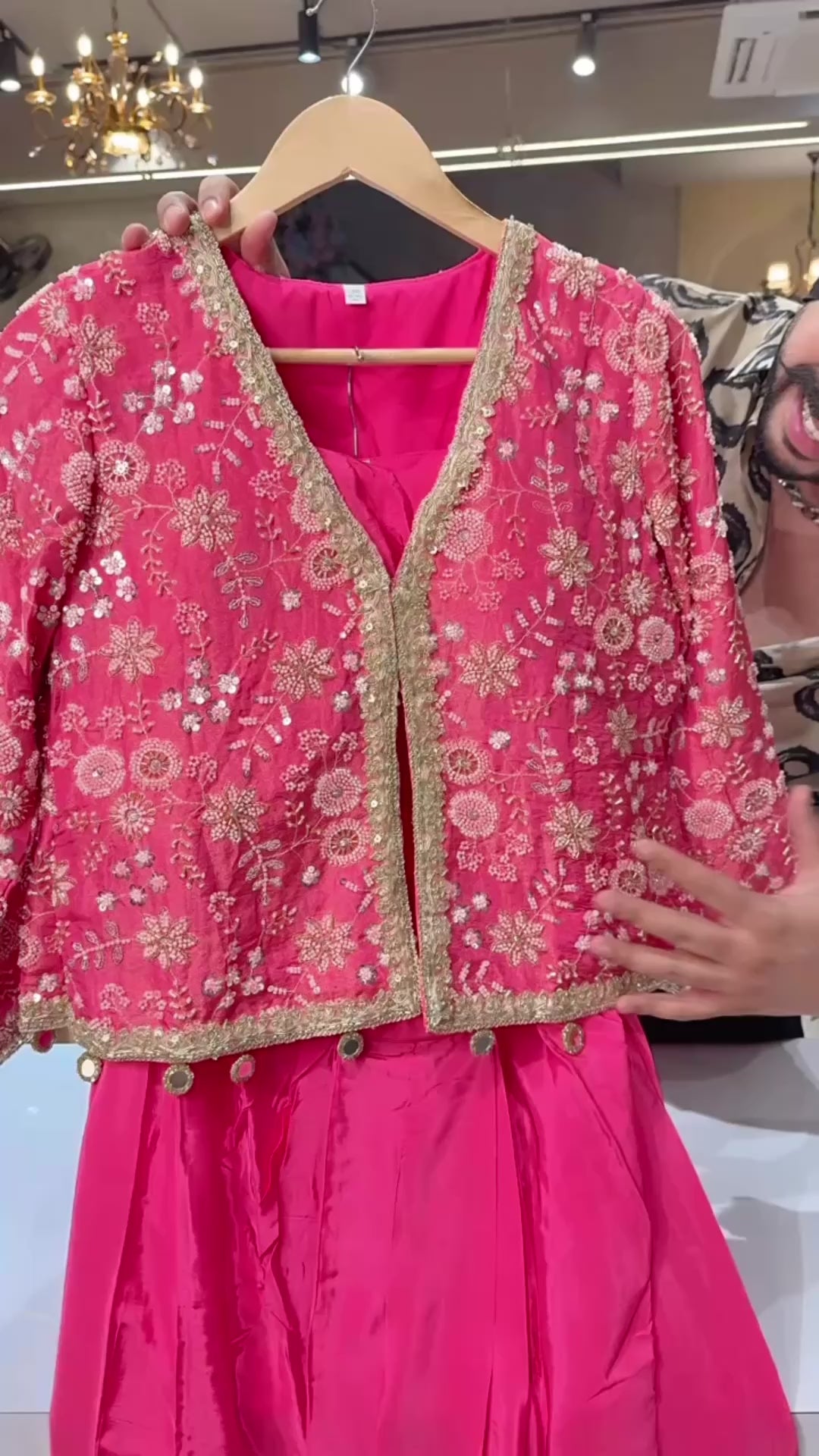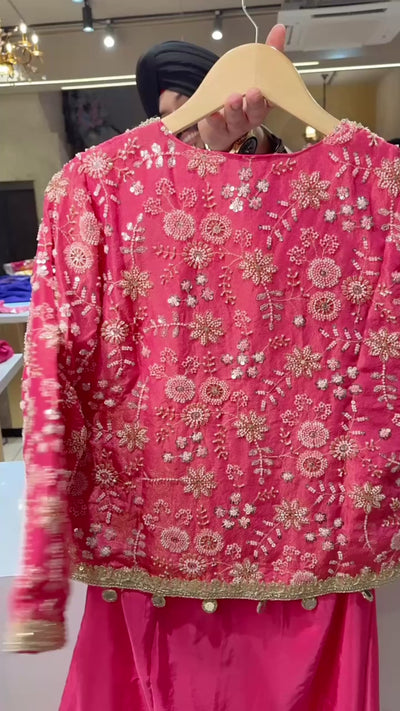 Pink Crepe Drape Crop Set with Heavy Hand embroidered Short Jacket & Potli