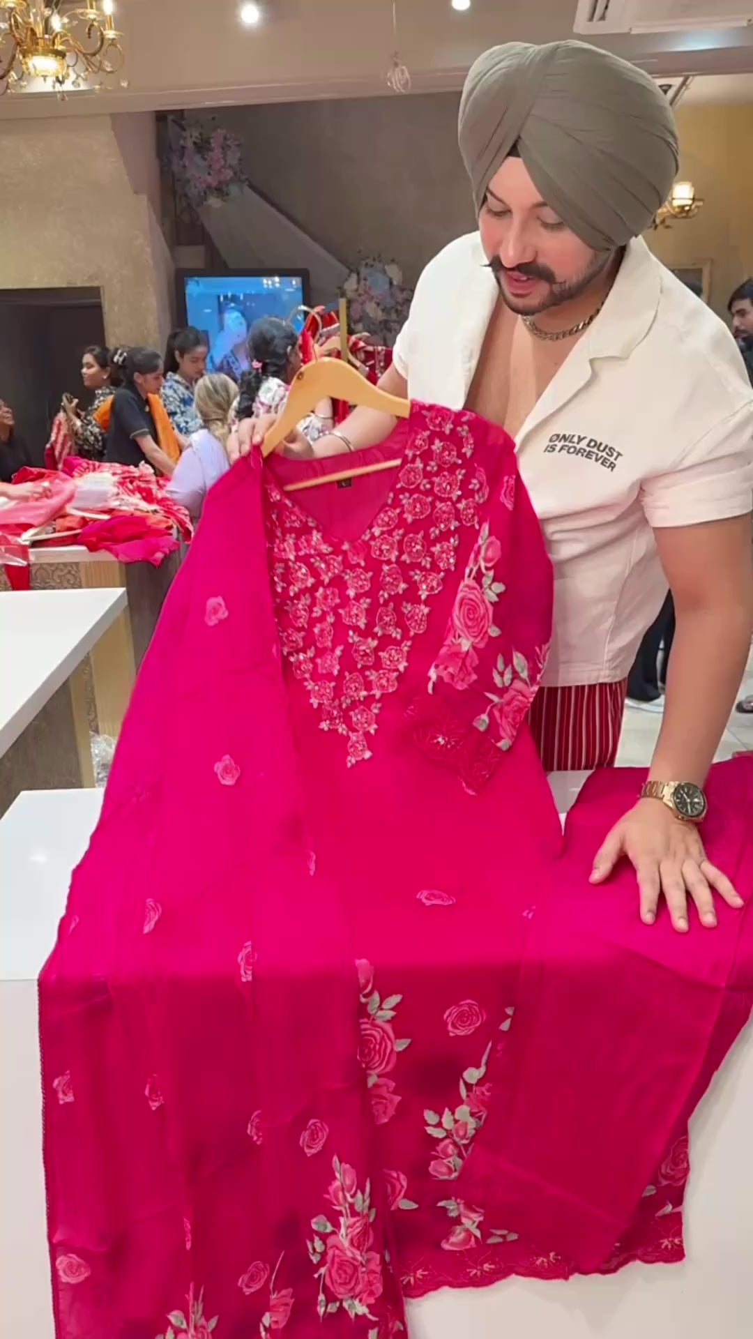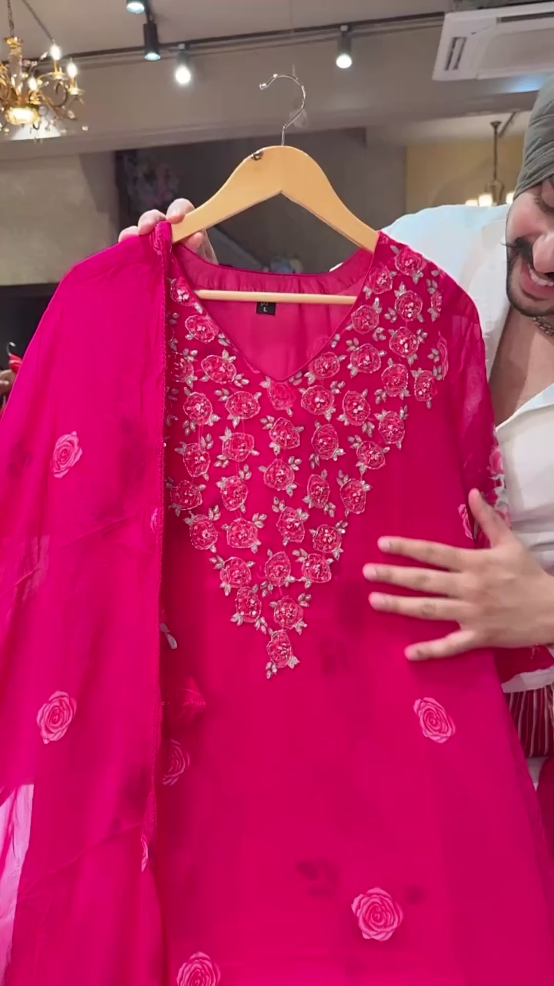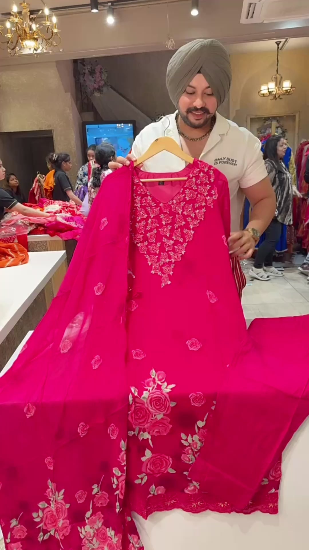 Hot Pink Georgette Floral Print Party Wear Straight Suit with Hand embroidery Work on neck