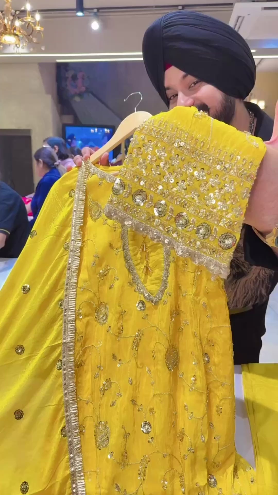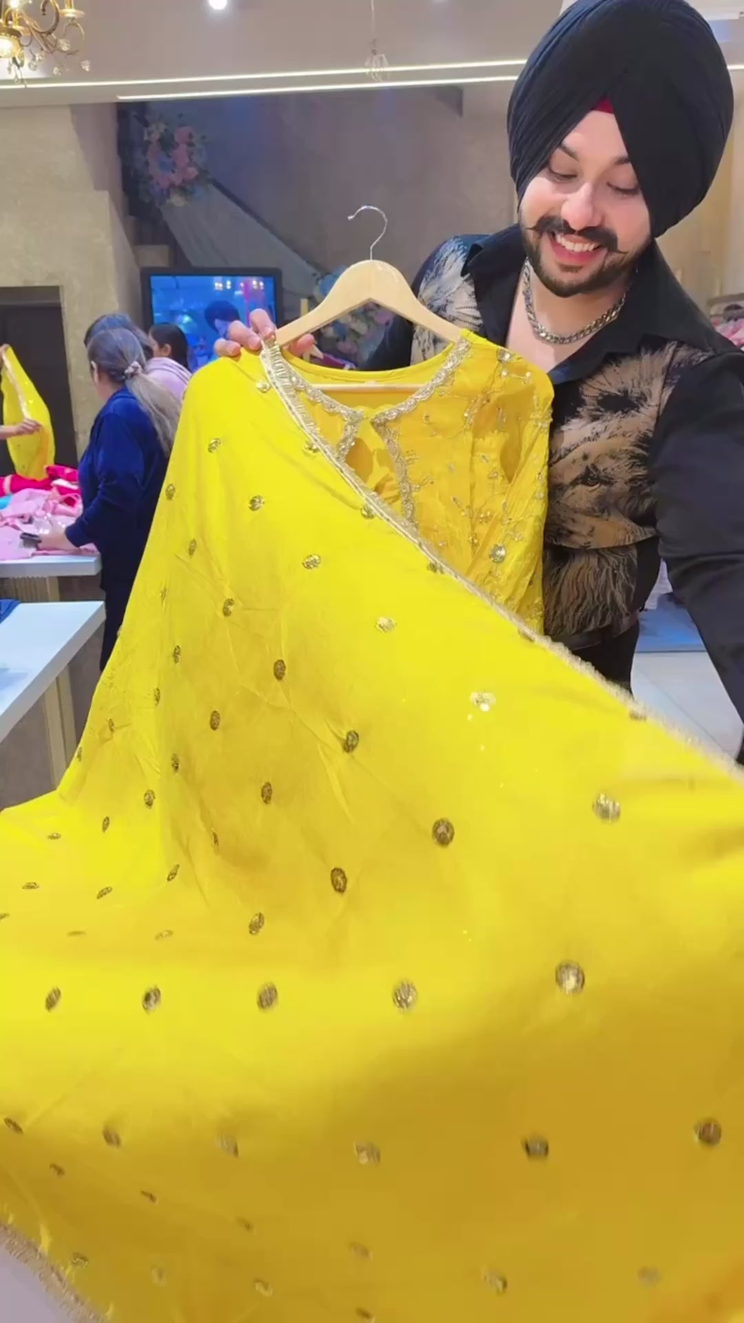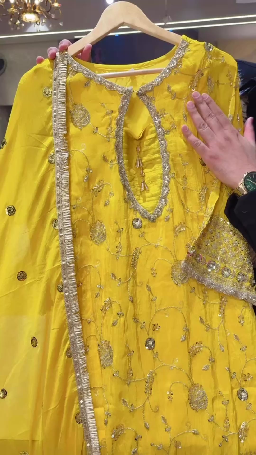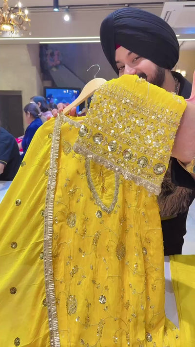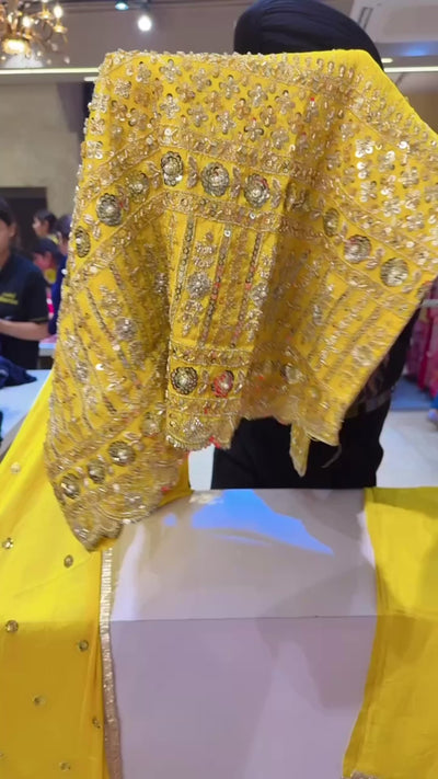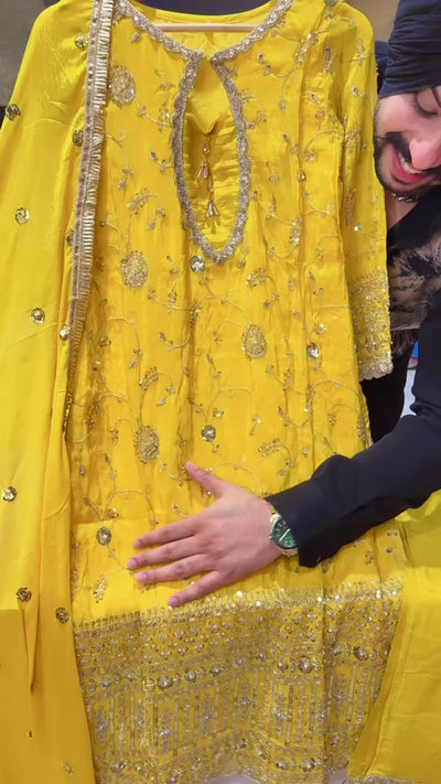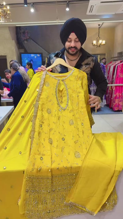 Vibrant Yellow Shimmer Silk Designer Neck Heavy Embroidered Straight Suit with Beautiful Chion Duppata