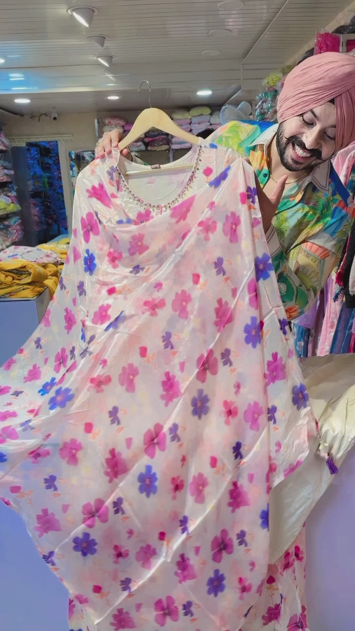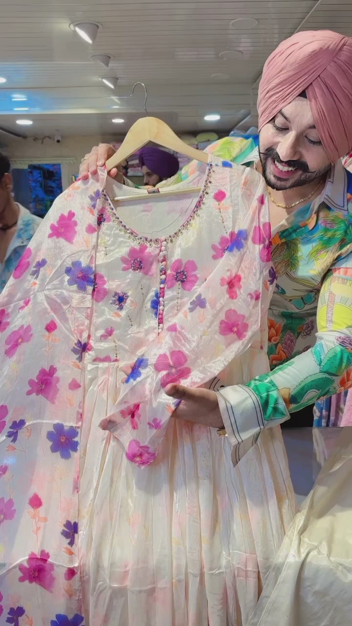 Cream Chinon Hand embroidered Anarkali suit with Beautiful Duppata