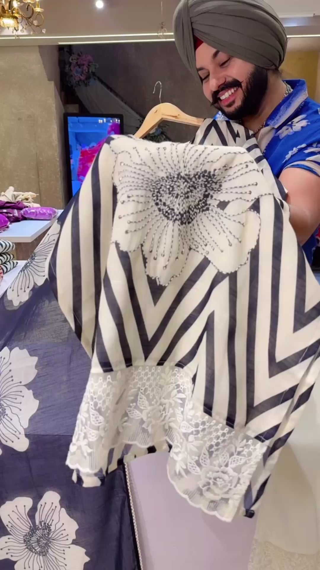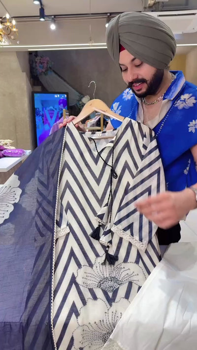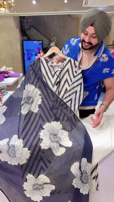 Cream & Dark blue Geometrical Print Embroidered Straight Suit With Beautiful Floral Print Duppata