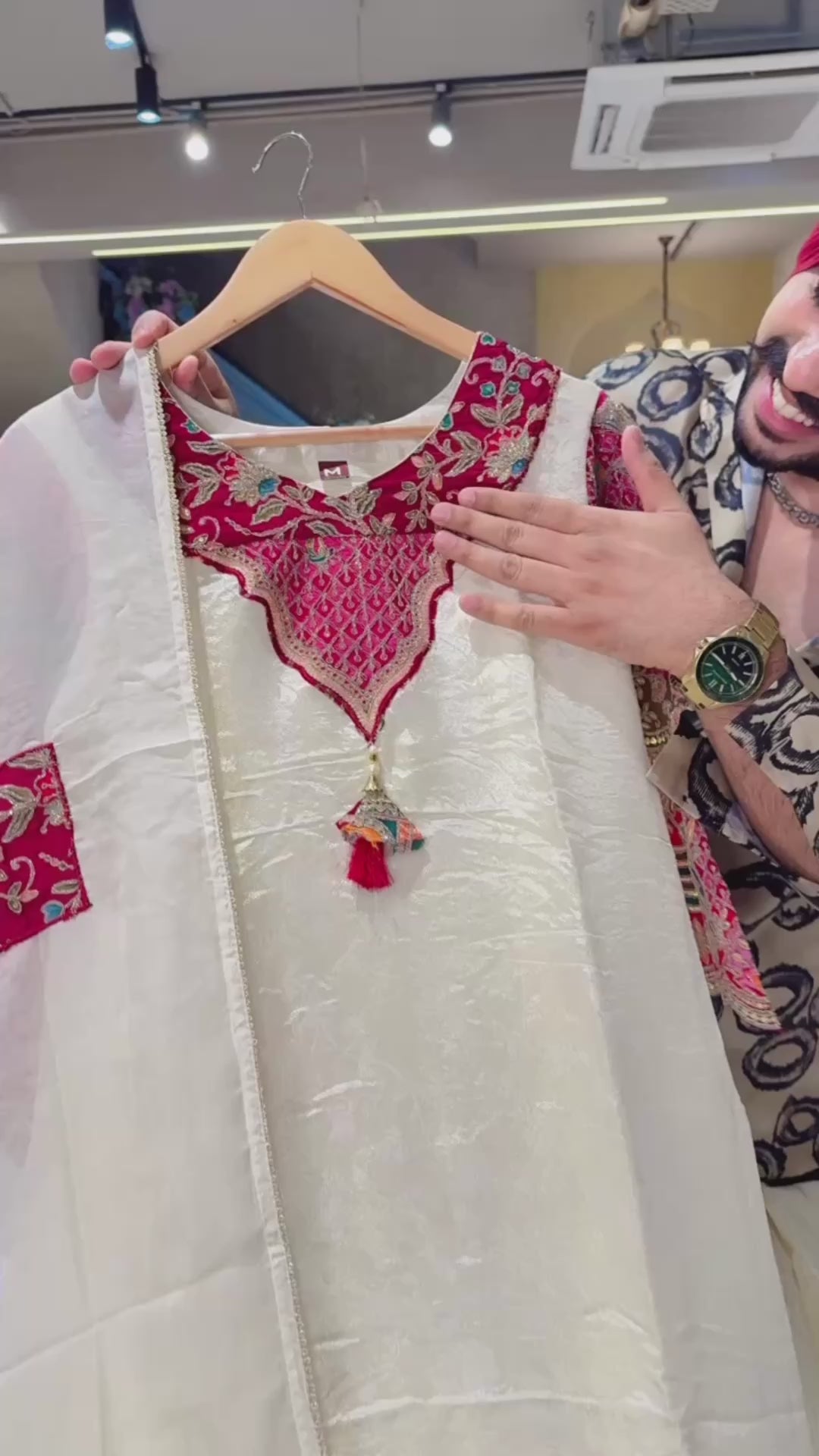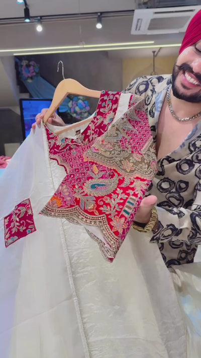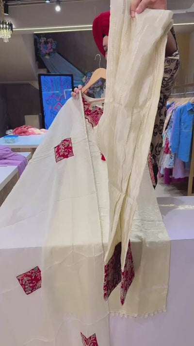 Cream & maroon jacquard Silk Party wear suit with heavy embroidery work on Sleeves, Neck, Pants & Duppata